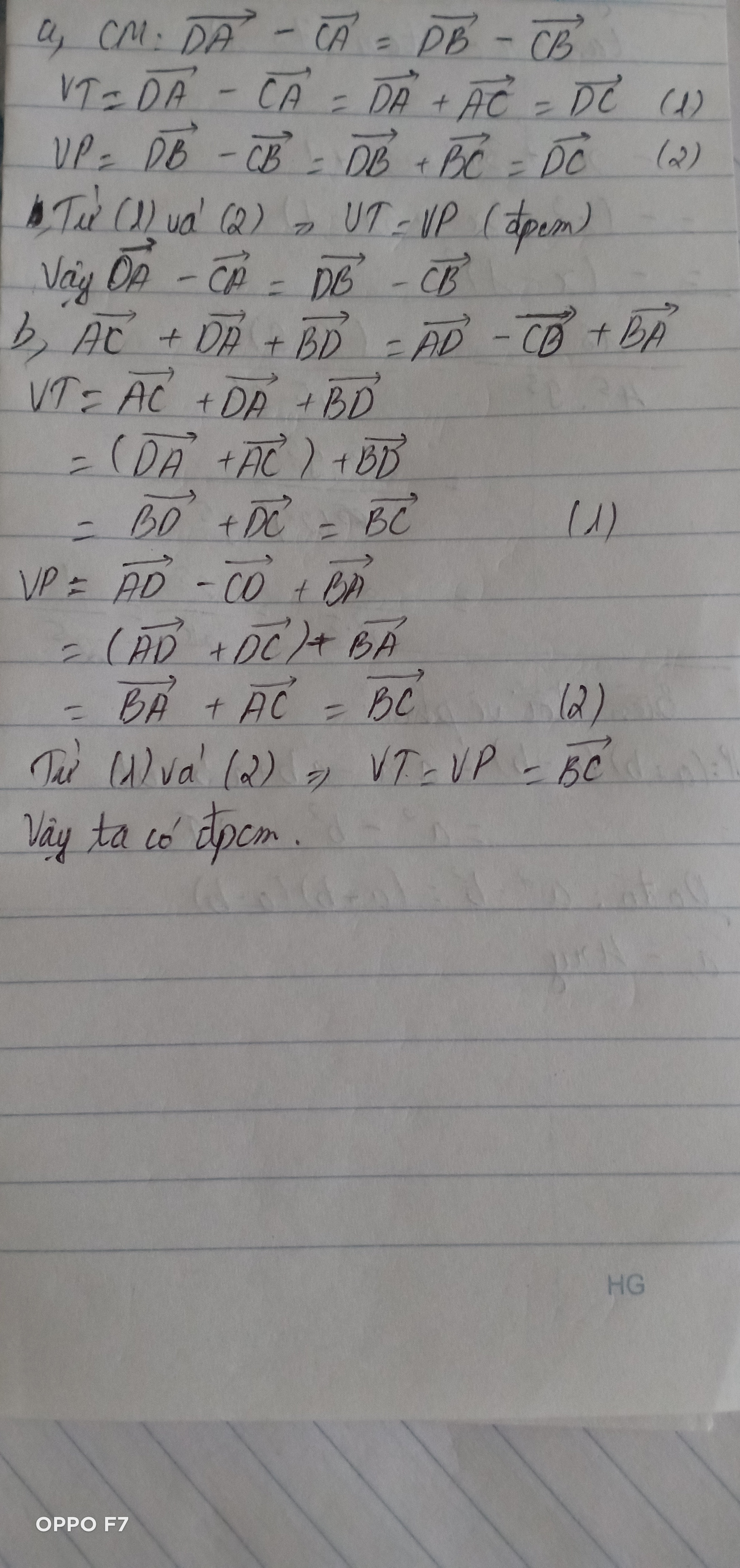 Cho 4 điểm A , B , C , D . Chứng minh rằng : a ) Các vectơ DA - CA = DB - CB b ) Các vectơ AC + DA + BD = AD - CD + BA