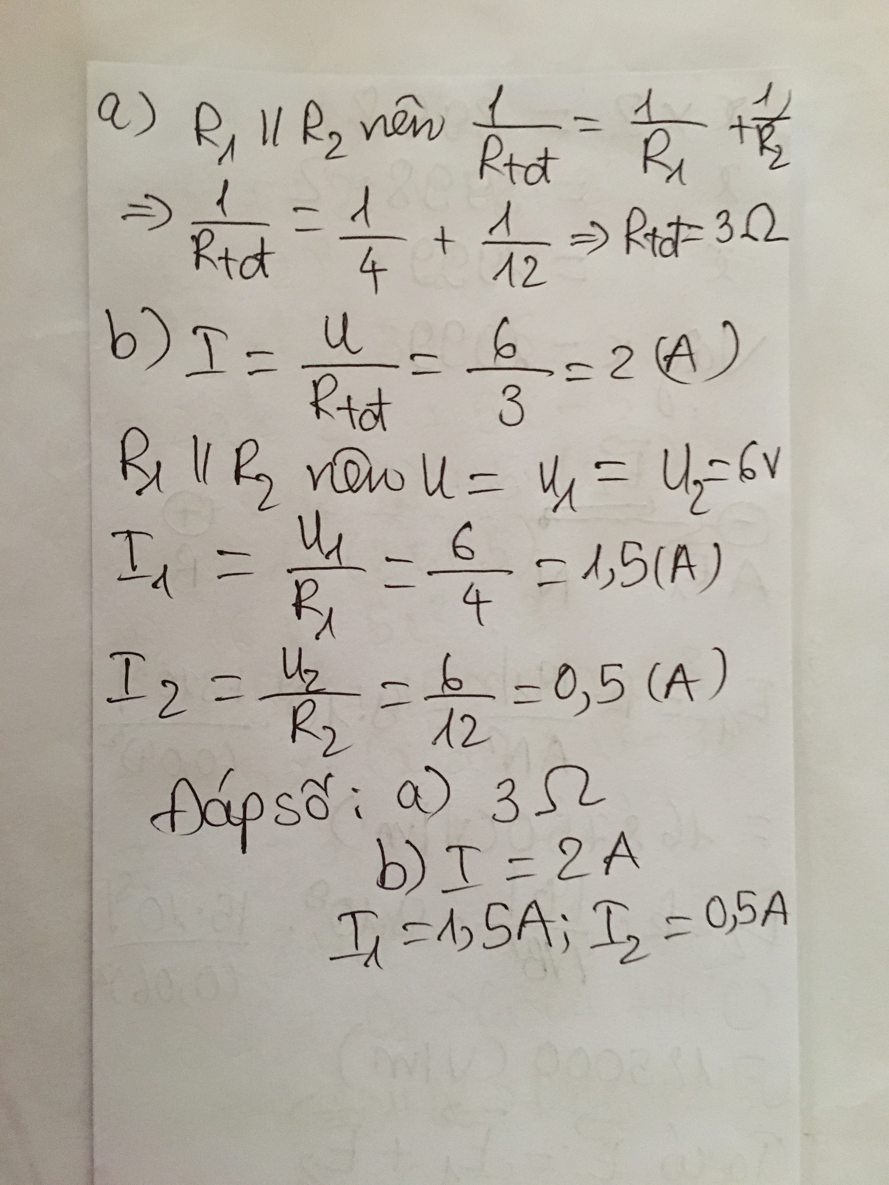 Cho 2 điện trở R1= 4 ôm ,R2= 12 ôm mắc song song vào hiệu điện thế 6V