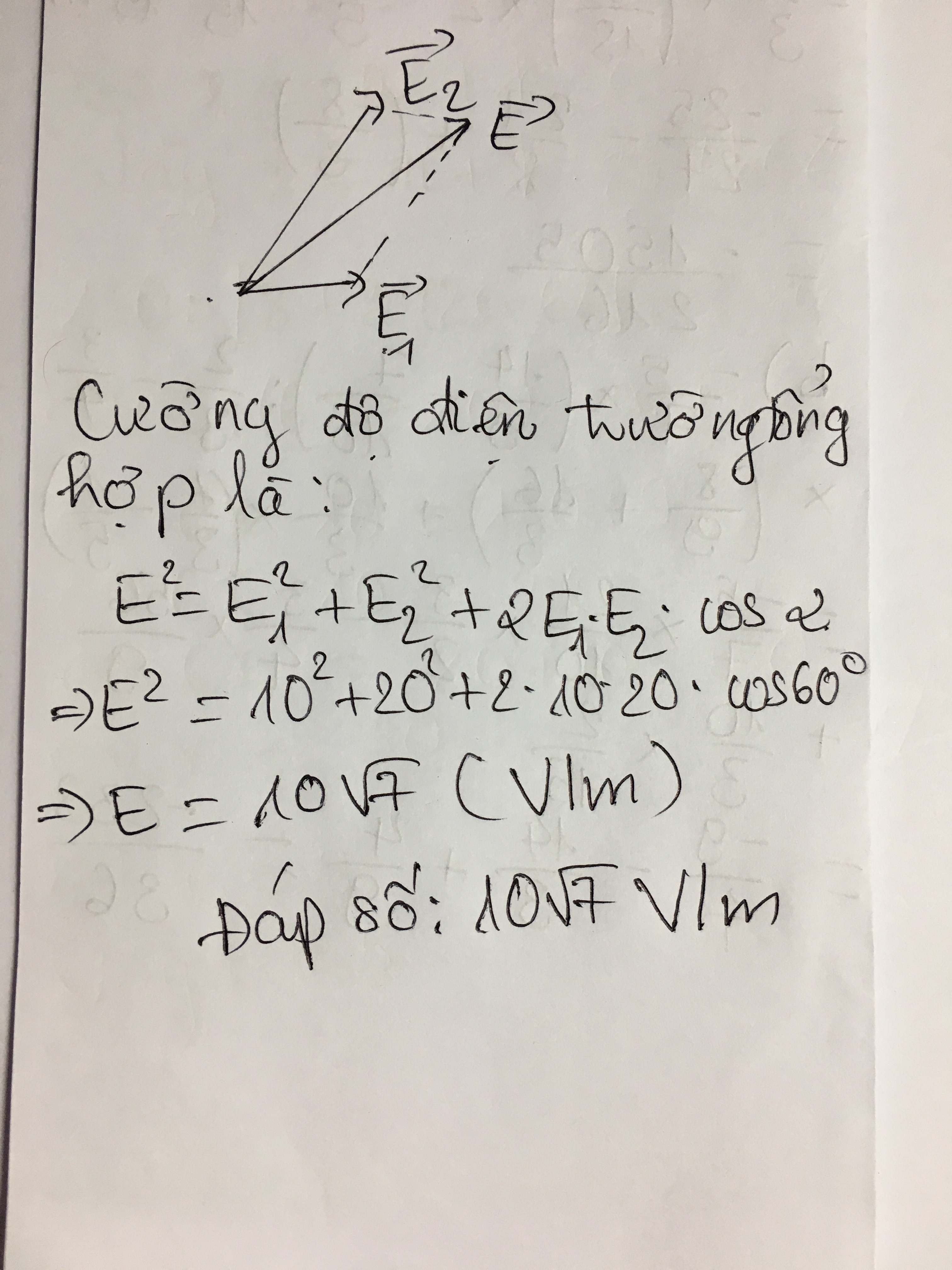 Tại 1 điểm có 2 cường độ điện trường thành phần hợp với nhau 1 góc 60° và có độ lớn là 10V/m và 20V/m .Tính cường độ điện trường tổng hợp tại điểm đó