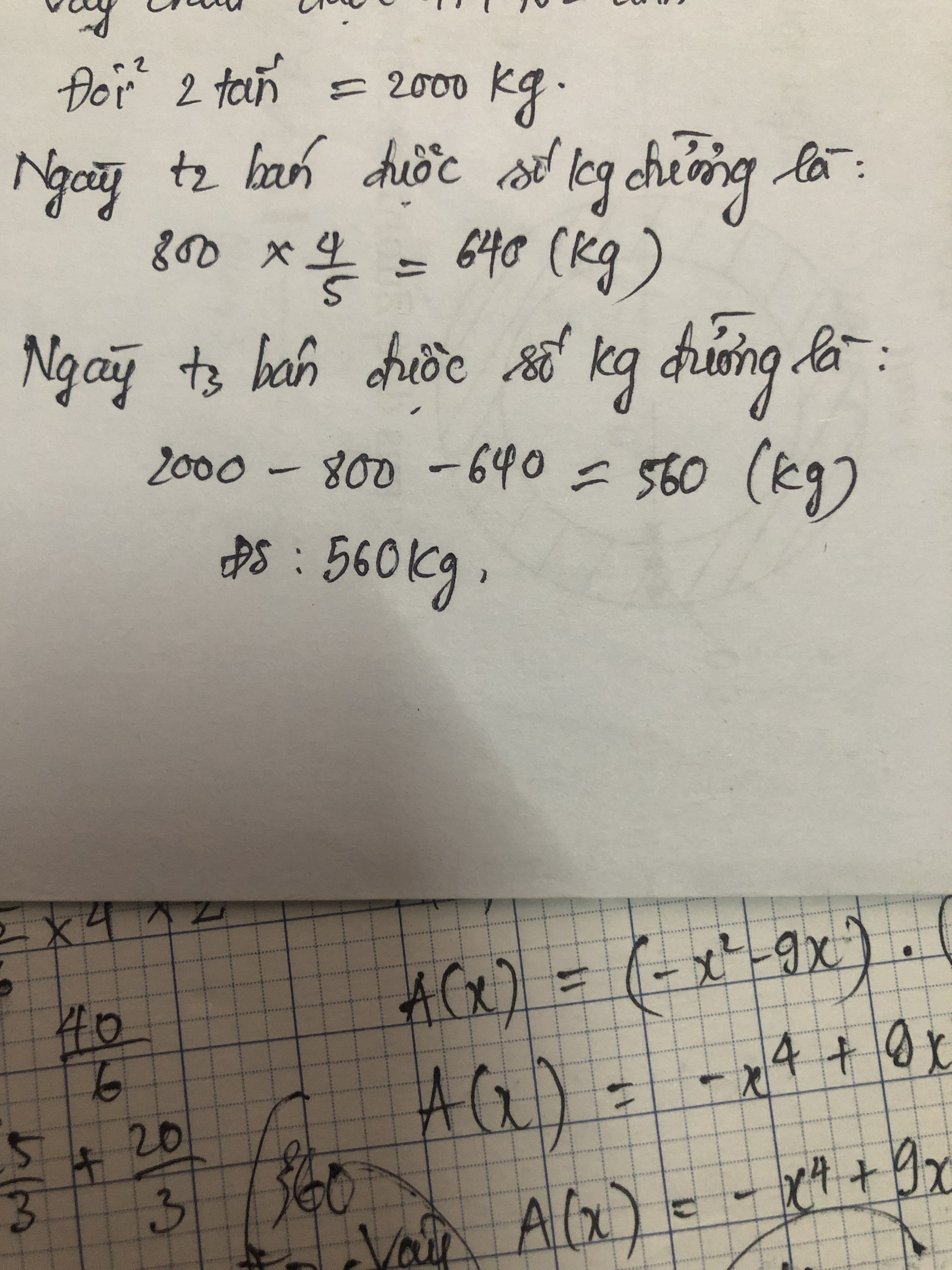 Một cửa hàng trong ba ngày bán được có 2 tấn đường. Ngày đầu bán được 800kg.Ngày thứ hai bán 4/5 số đường trong ngày đầu. Hỏi ngày thứ ba bán bao nhiêu ki lô gam đường?