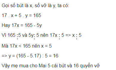 Đầu năm học,mai được mẹ mua cho một số bút và một số quyển vở hết tất cả 165 nghìn đồng.biết một chiếc bút giá 17 nghìn đồng ,một quyển vở giá 5 nghìn đồng.hỏi mẹ mua cho mai bao nhiêu cái bút và bao nhiêu quyển vở