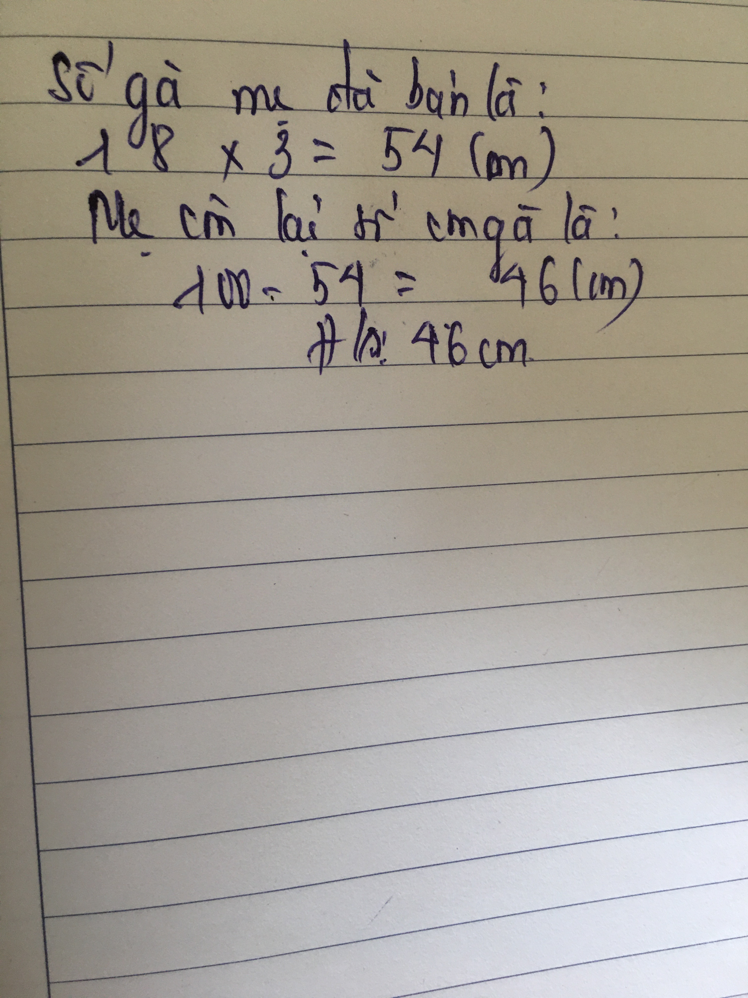 Mẹ nuôi được 100 con gà mẹ đã bán bán 3 lần mỗi lần 18 con hỏi mẹ còn lại bao nhiêu con gà