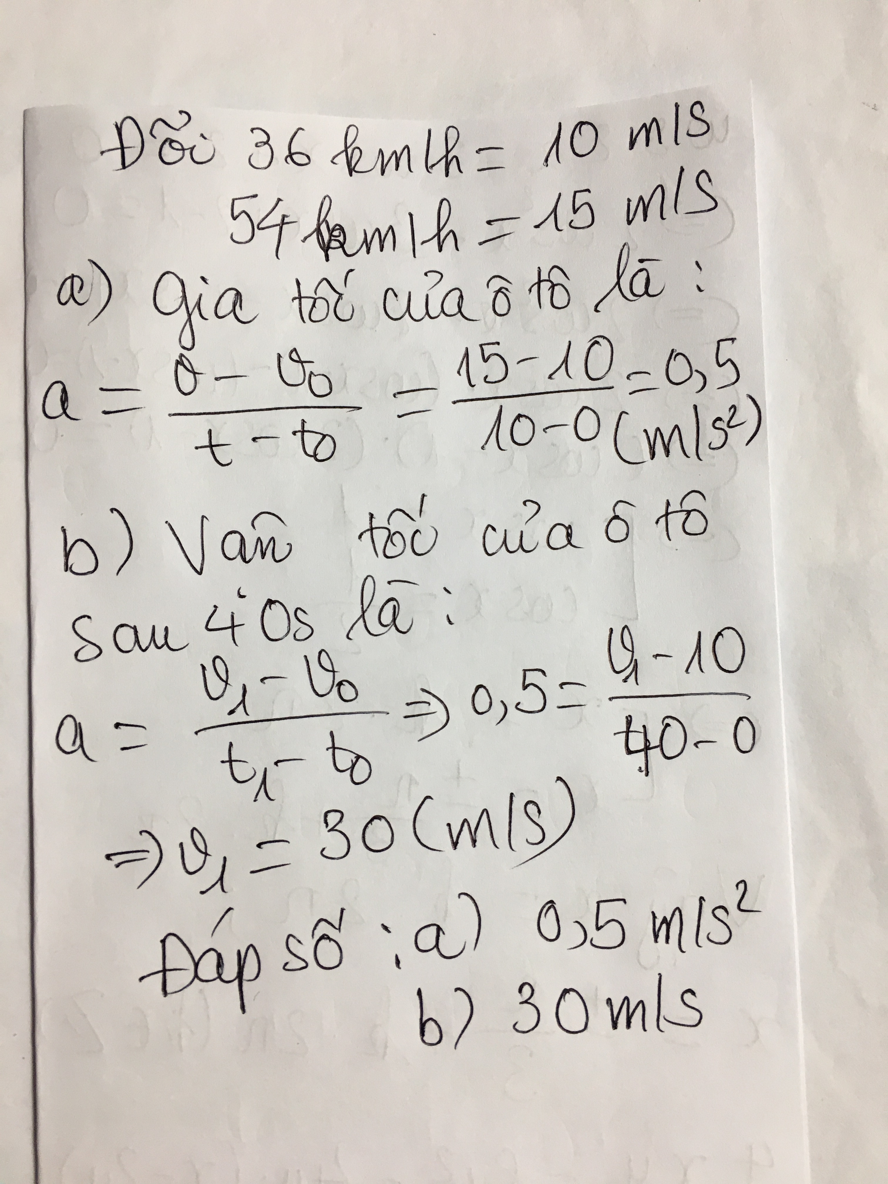 Khi ô tô đang chạy với vận tốc tốc 36km/h trên đoạn đường thẳng thì người lái xe tăng ga và ô tô chuyển động nhanh dần đều . Sau 10s ,ô tô đạt vận tốc 54km/h .
