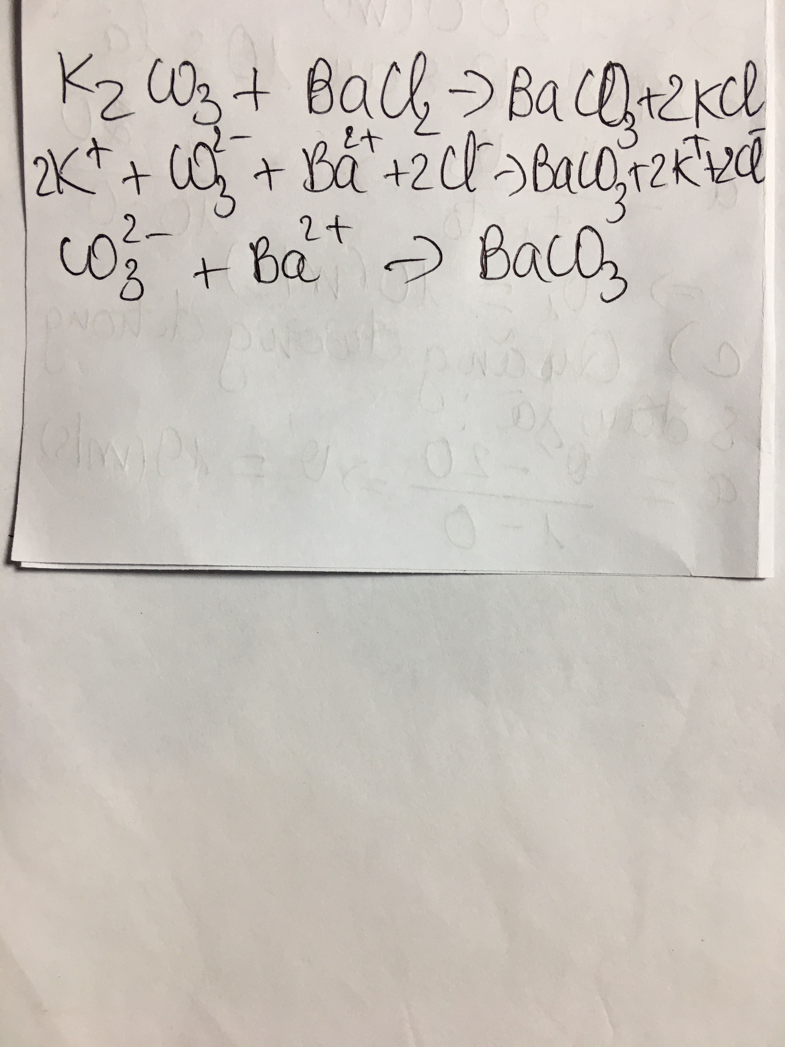 2K(+) + CO3(2-) + BA(2+) +2Cl(-) ------ BACO3 + 2K(+) +2Cl(-)