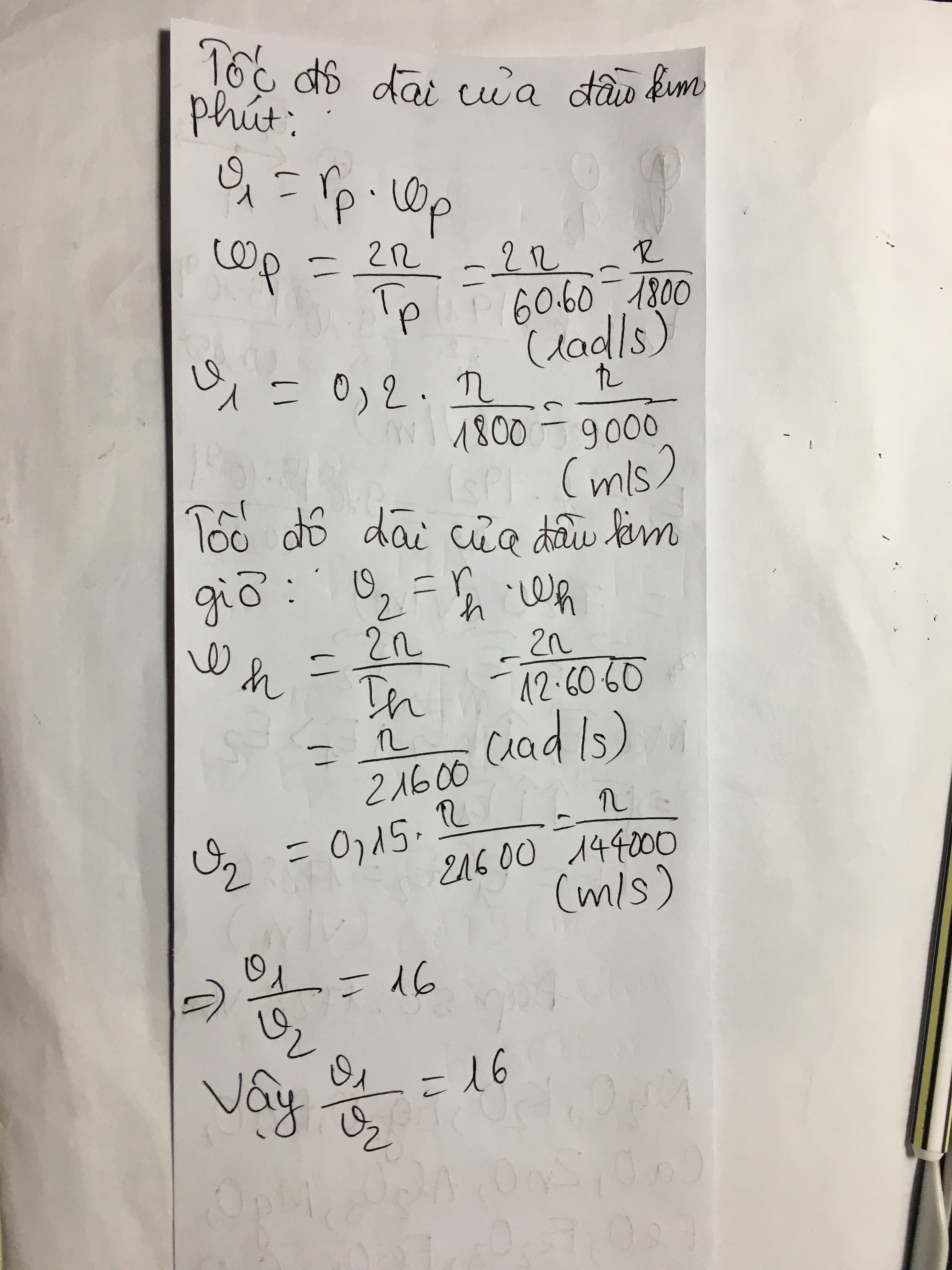 Chiều dài của kim phút một đồng hồ là 20cm, của kim giờ là 15cm. Tỷ số tốc độ dài của đầu kim phút so với đầu kim giờ là:
