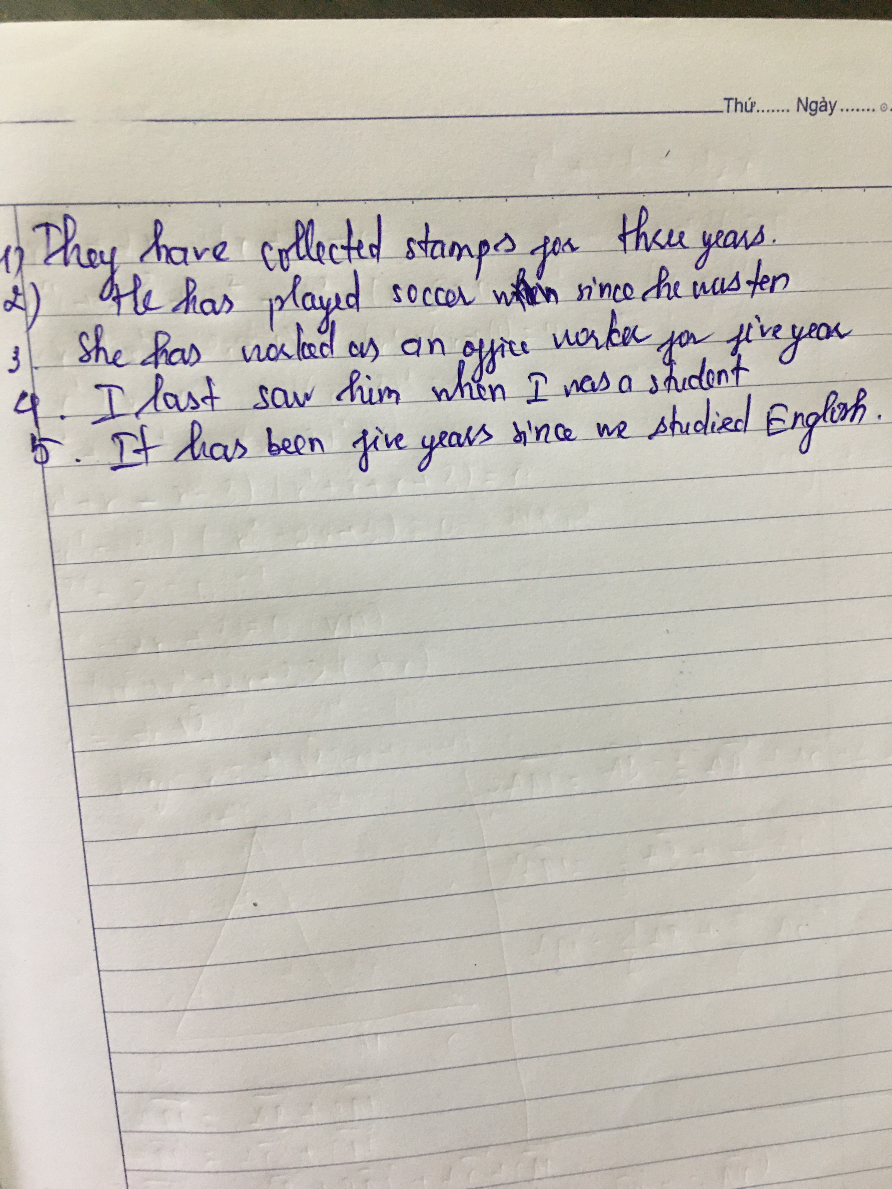 5. We have studied English for five years.