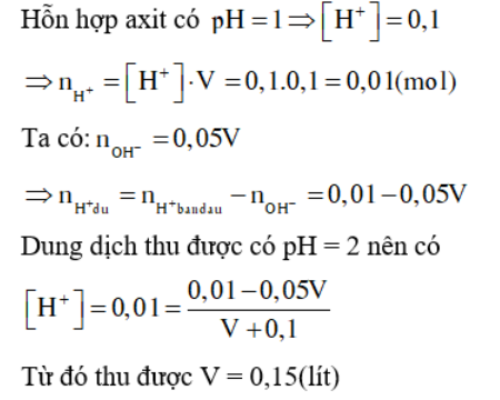 Cho dung dịch X gồm hno3 và hcl có ph=1.Trộn V(ml) dung dịch ba(oh)2 0.025M với 100ml dd X thu được dd Y có ph=2.Giá trị của V
