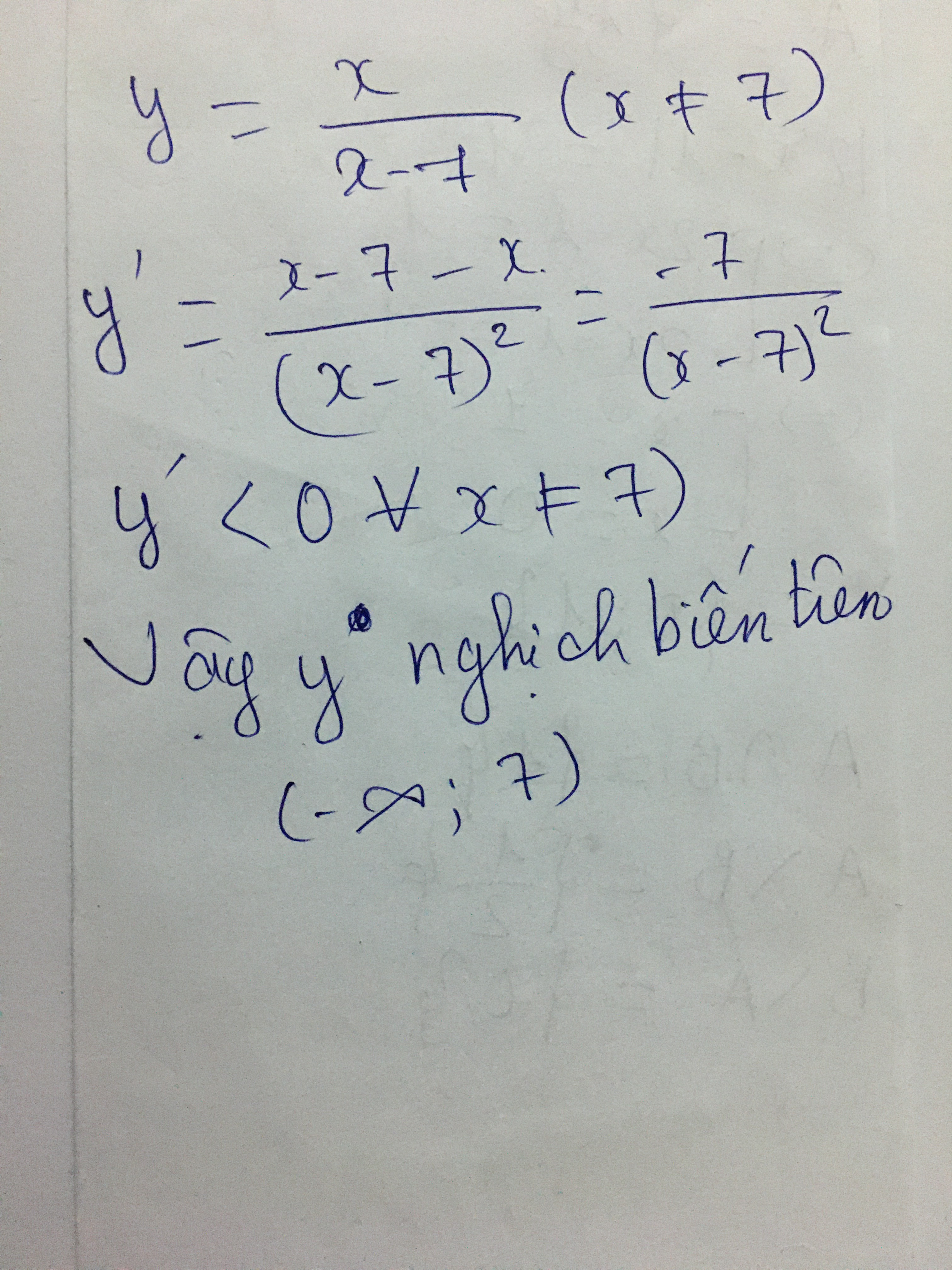 xét tính đồng biến , nghịch biến của hàm số : y=x/x-7 trên ( -vô cực , 7)