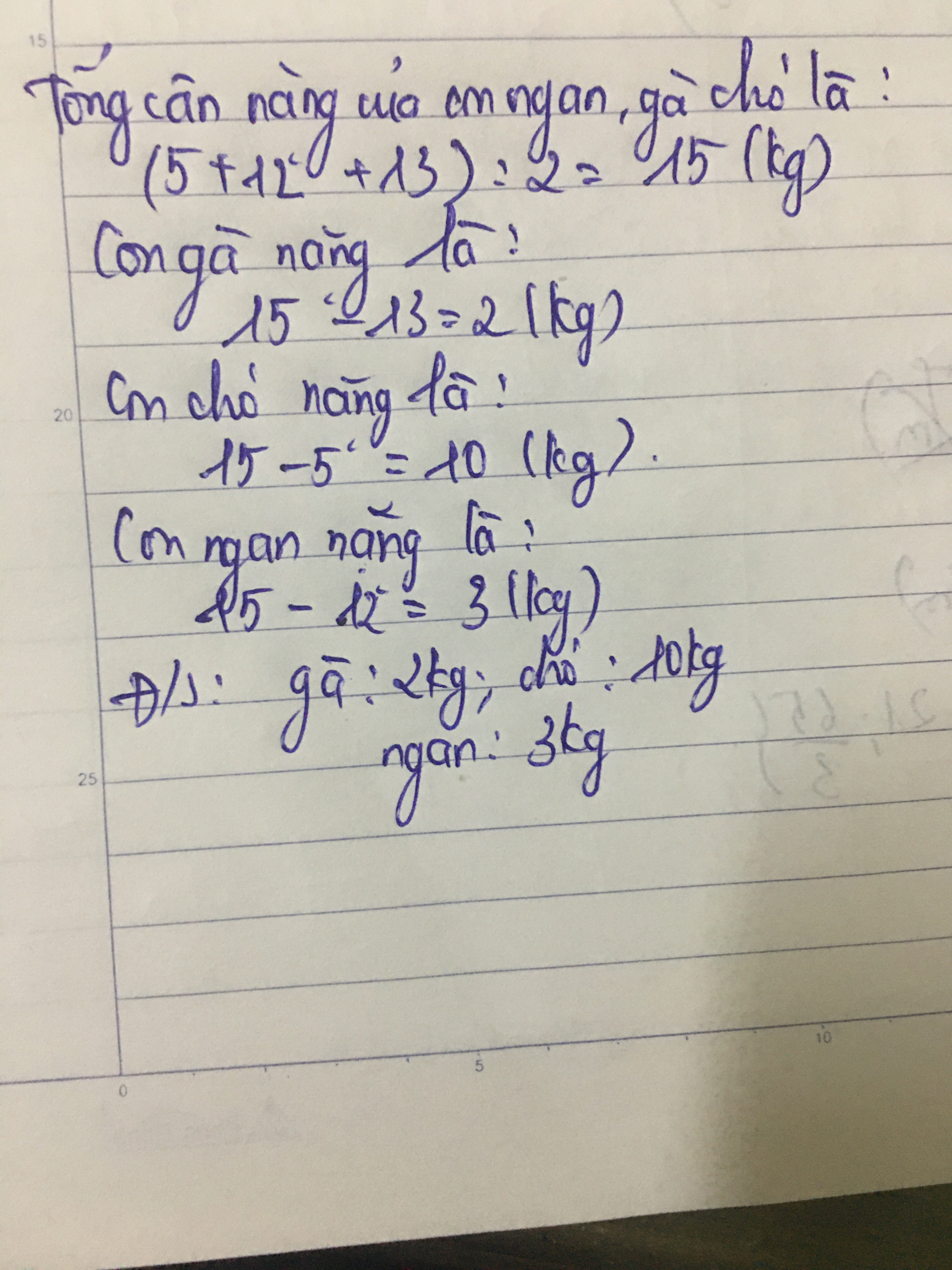Đáp số: con gà 2kg; con ngan 3kg; con chó 10kg