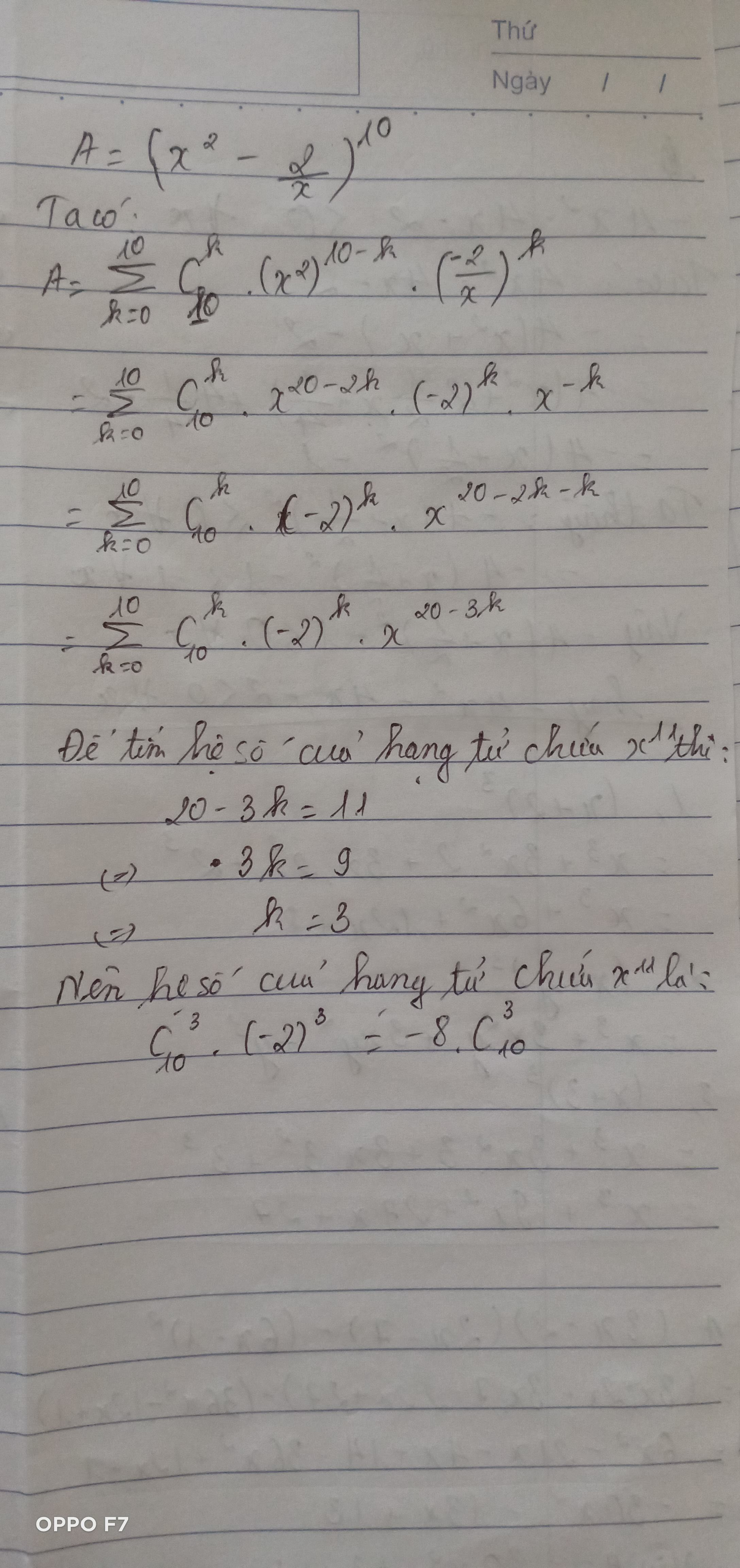 Tìm hệ số của số hạng chứa x^11 trong khai triển (x^2 - 2/x )^10
