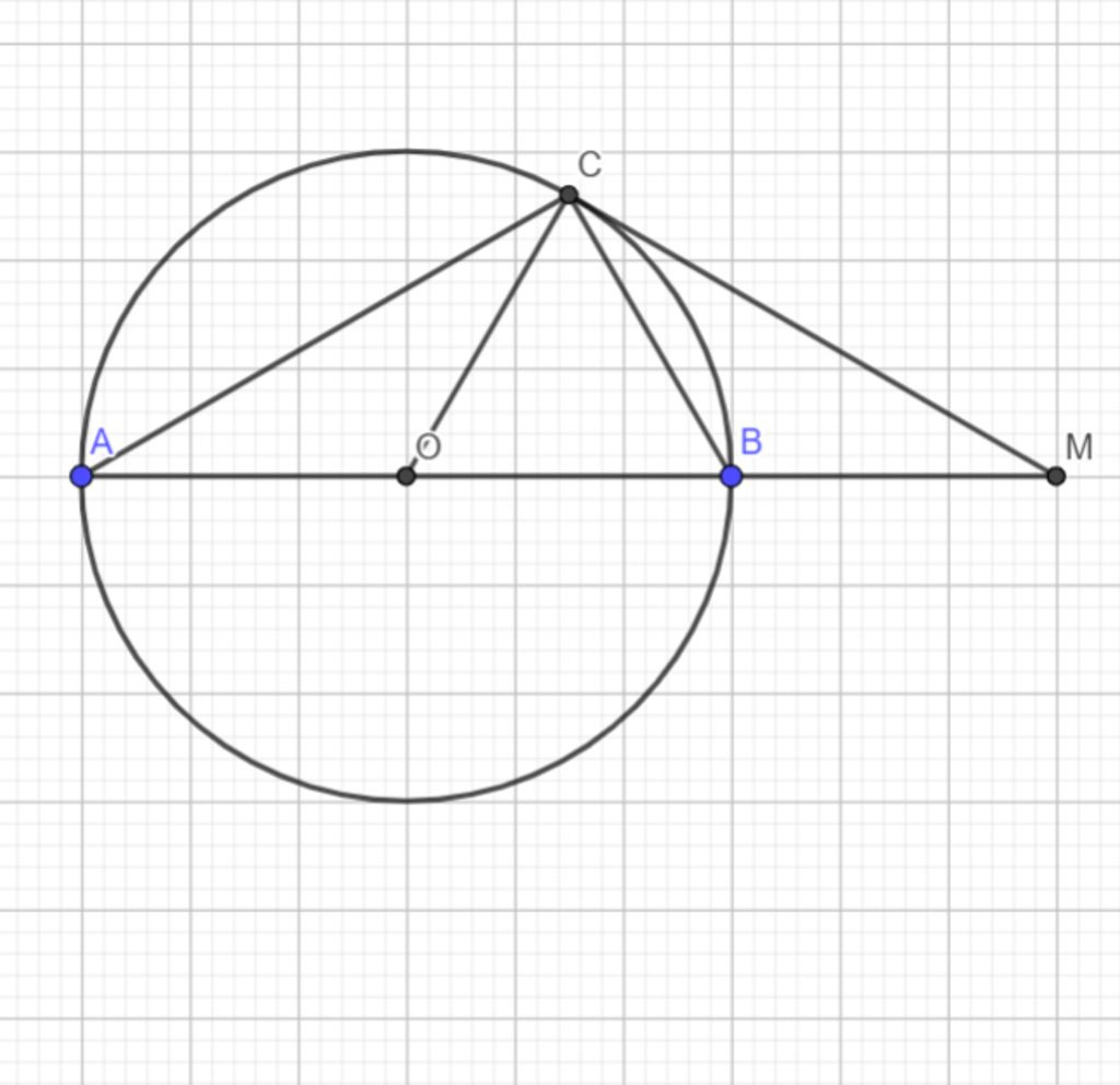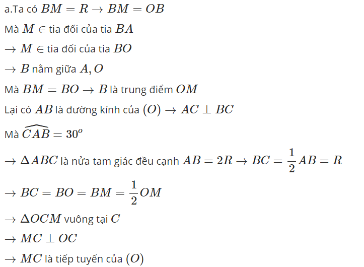 Cho đường tròn (O;R) đường kính AB. Vẽ dây AC sao cho góc CAB=30°. Trên tia đối của tia BA, lấy điểm M sao cho BM=R. Chứng minh rằng MC là tiếp tuyến của đường tròn (O)