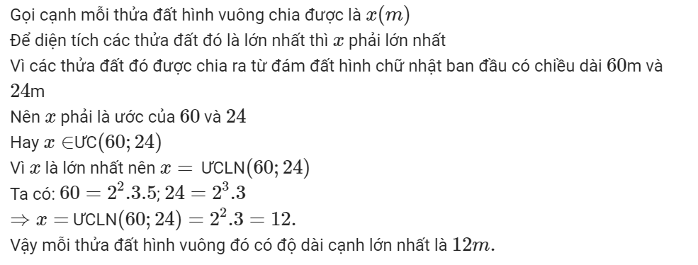 MỘT KHU ĐẤT HÌNH CHỮ NHẬT CHIỀU DÀI 60M , CHIỀU RỘNG 24M. người ta chia thành những thửa đất hình vuông bằng nhau ko thừa mảnh nào . hỏi độ dài lớn nhất của cạnh mỗi thửa hình vuông là bao nhiêu ?