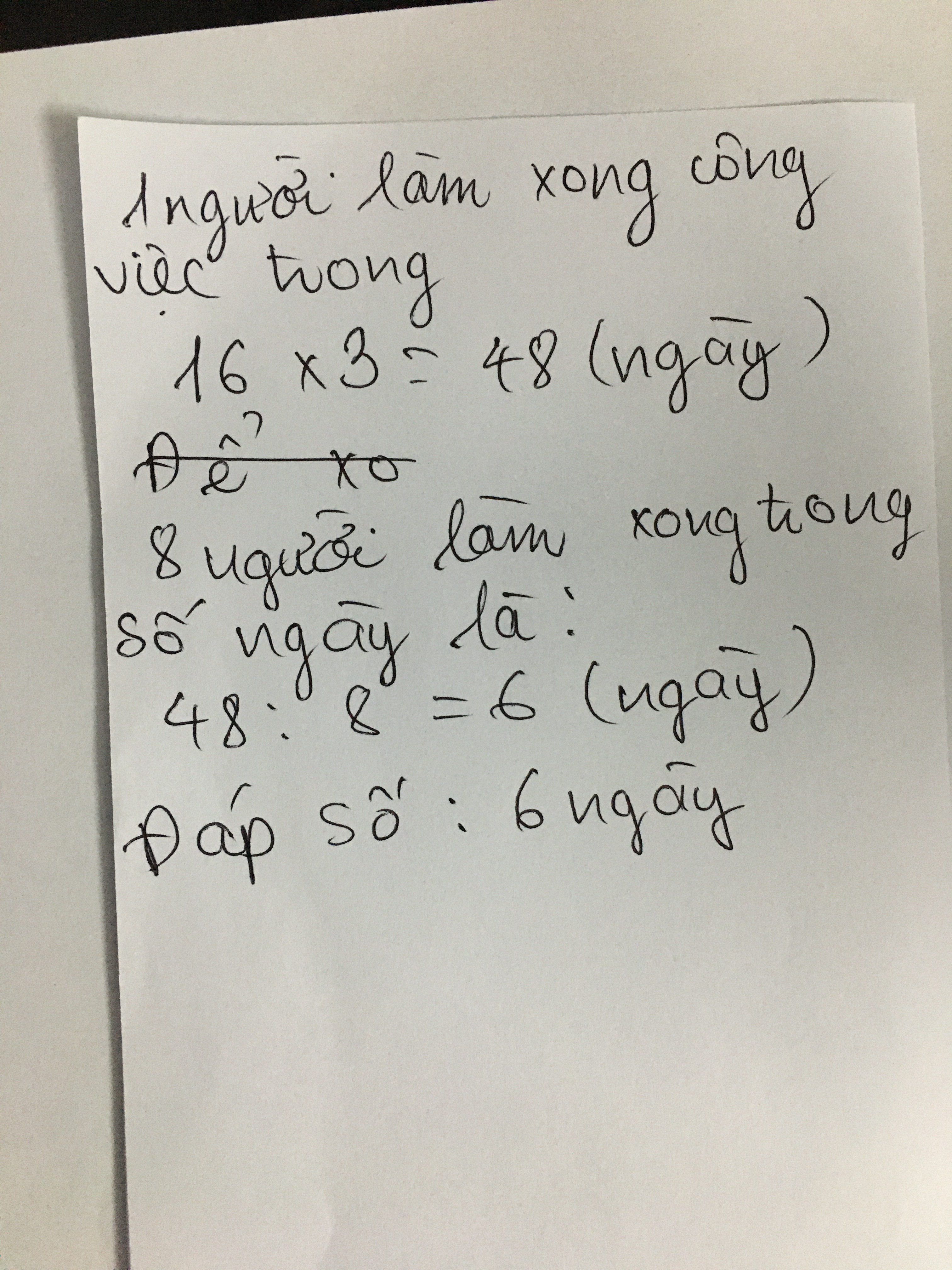 16 người làm xong một công việc trong 3 ngày . Hỏi 8 người thì làm xong công việc đó trong bao nhiêu ngày [ bài giải ]