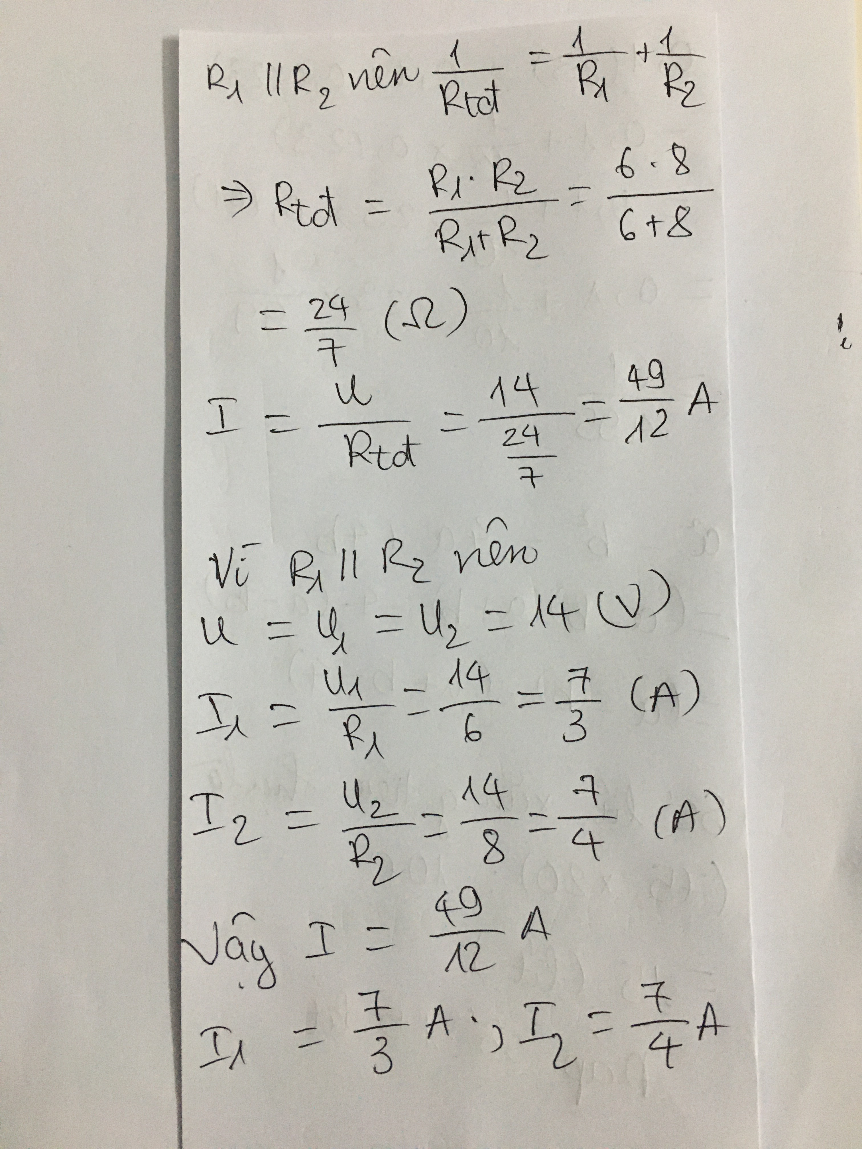 Cho điện trở R1 Mắc song song với điện trở R2, Có R1 =6 ôm , R2 = 8 ôm , Biết U =14v . Tính: