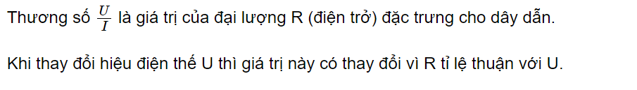 C1. Nếu đặt hiệu điện thế U giữa hai đầu dây dẫn và I là cường độ dòng điện chạy qua dây dẫn đó thì thương số là giá trị nào của đại lượng nào đặc trưng cho dây dẫn? Khi thay đổi hiệu điện thế U thì giá trị này có thay đổi không? Vì sao?