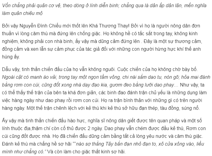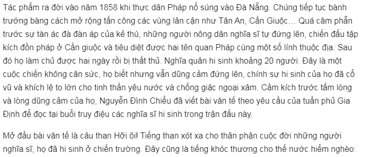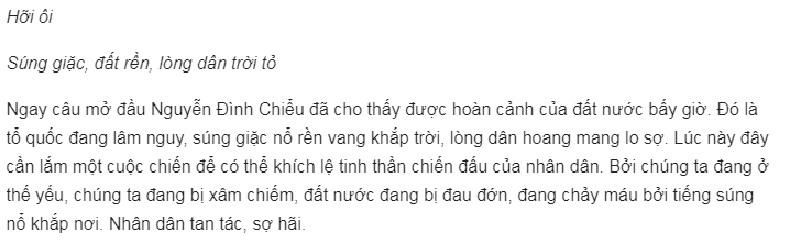 Tiếng kêu thán “Hỡi ơi” mở đầu bài thơ nghe sao thật da diết. Tiếng khóc than vang lên giữa đất trời như lời tiếc thương cho linh hồn người nghĩa sĩ nông dân Cần Giuộc. Cuộc đời người sống anh dũng, chết đi cũng thật vẻ vang.