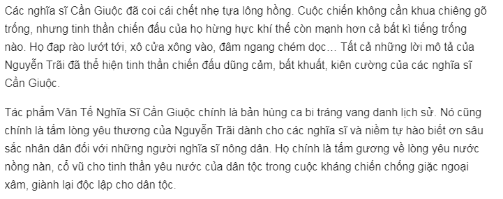 “Văn tế nghĩa sĩ Cần Giuộc” là niềm tự hào và biết ơn sâu sắc của nhân dân ta đối với người nghĩa sĩ nông dân đã anh dũng chiến đấu chống giặc ngoại xâm bảo vệ nền độc lập vững chắc của quê nhà. Đây là nơi họ đã sinh ra và lớn lên hay đó là Tổ quốc mà đối với họ, đây là điều rất quan trọng trong cuộc đời.