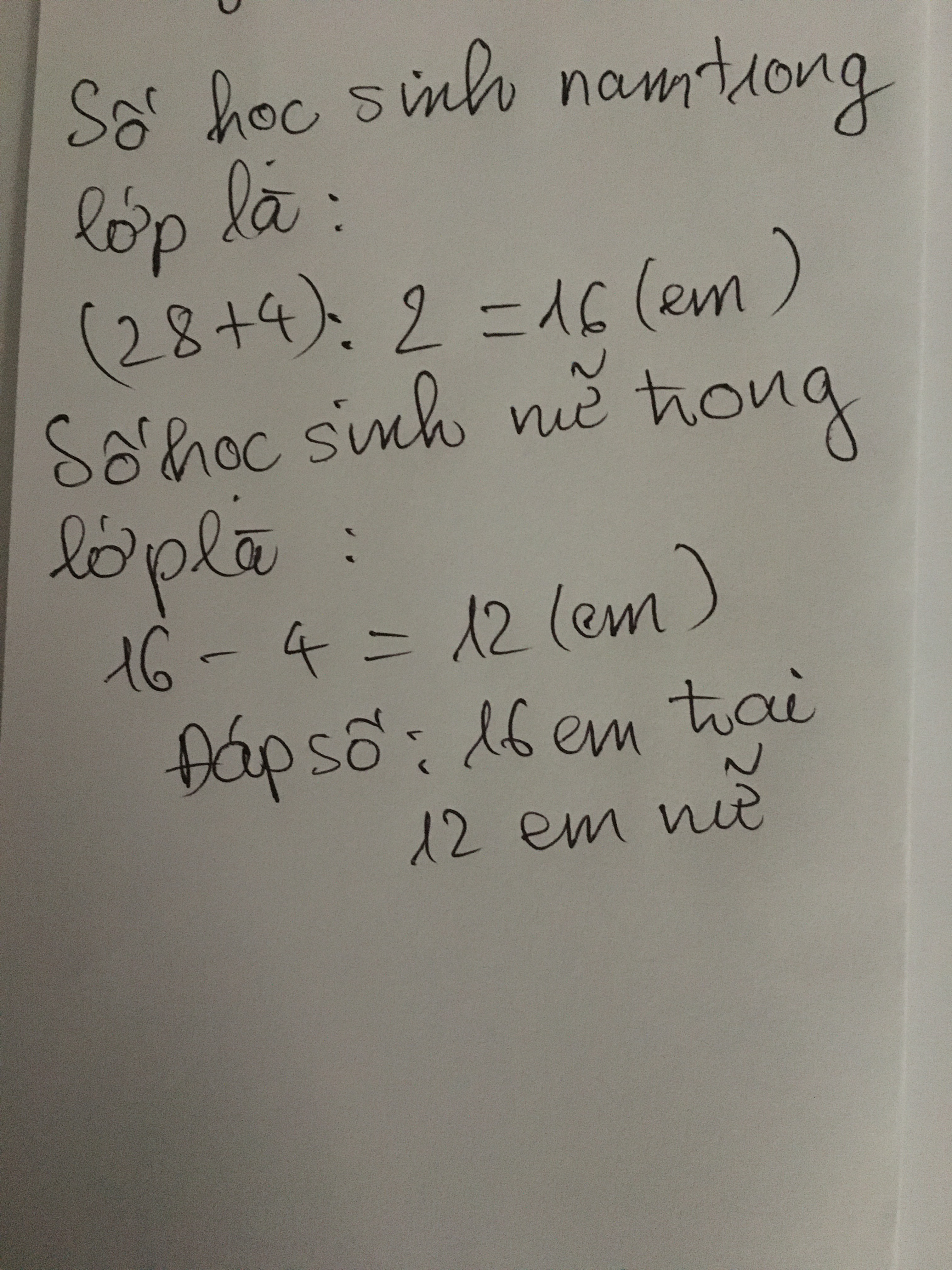 Đáp số: 16 học sinh nam; 12 học sinh nữ