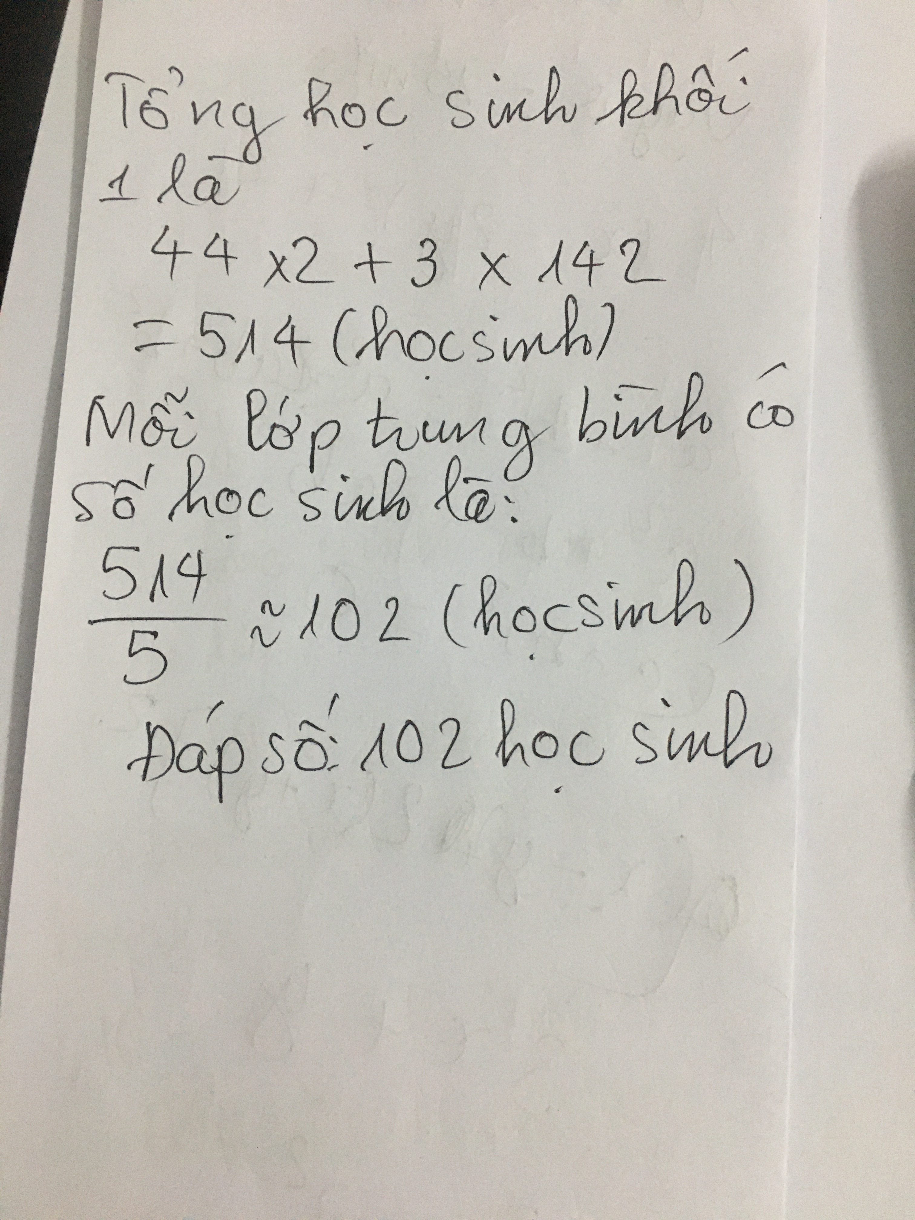 Khối 1 trường tiểu học có 5 lớp trong đó 2 lớp đầu mỗi lớp có 44 học sinh 3 lớp còn lại có 142 học sinh hỏi mỗi lớp có bao nhiêu học sinh?