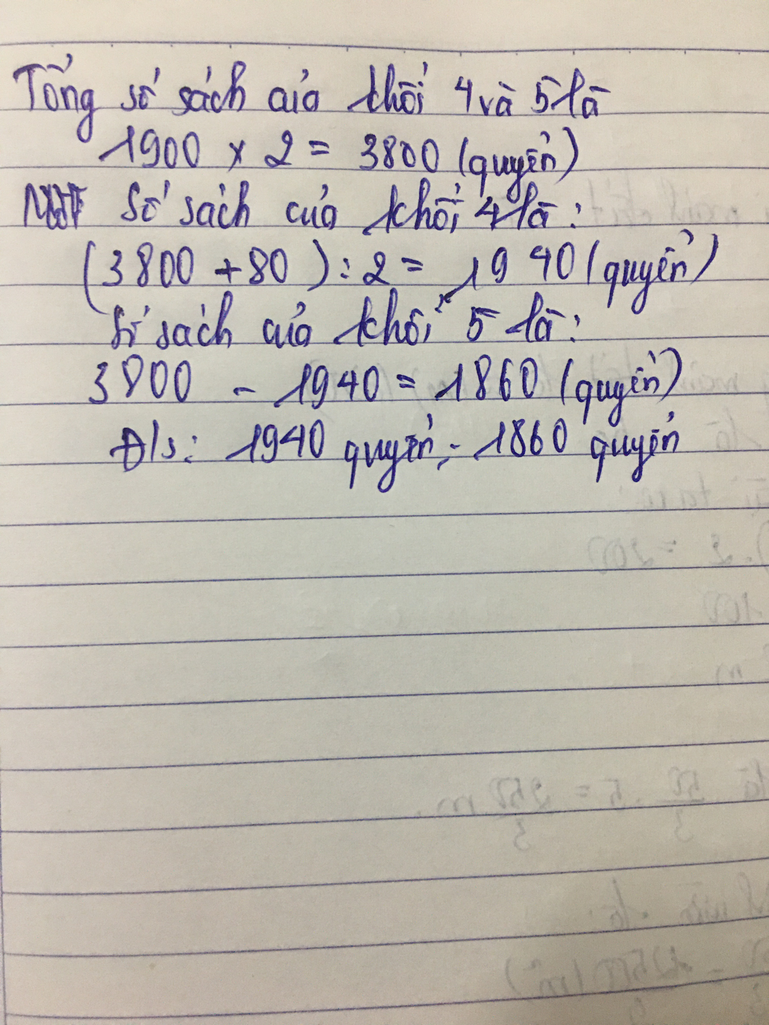 Trong tuần lễ sách Book Week của trường Tiểu học Vinschool Times City T36, học sinh khối 4 và học sinh khối 5 cùng quyên góp những quyển sách cũ. Trung bình mỗi khối đã quyên góp được 1900 quyển sách và khối 4 quyên góp được nhiều hơn khối 5 là 80 quyển sách. Hỏi mỗi khối quyên góp được bao nhiêu quyển sách?