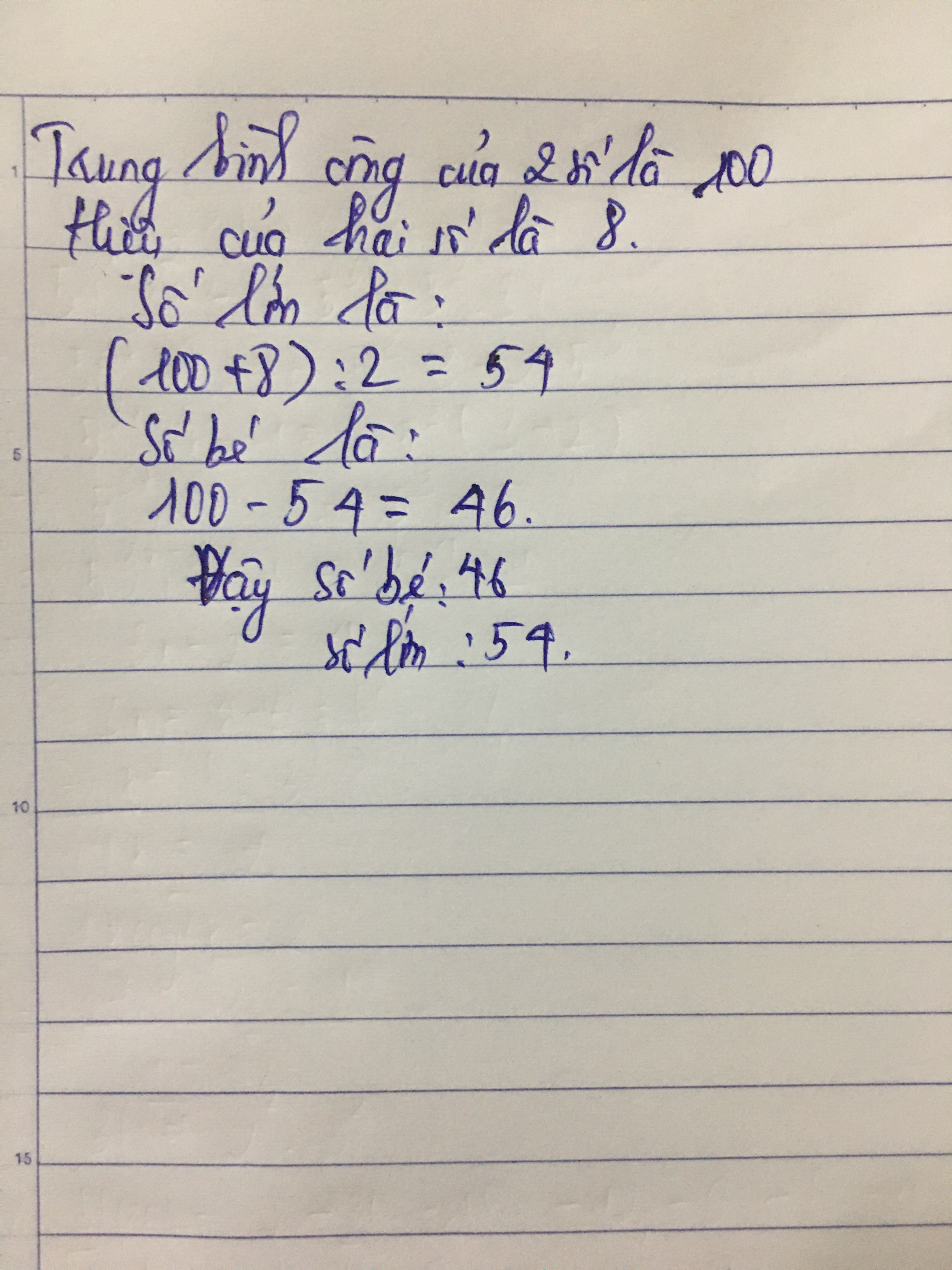 Trung bình cộng của hai số là số bé nhất có ba chữ số và hiệu của hai số là số chẵn lớn nhất có một chữ số . Tìm hai số đó