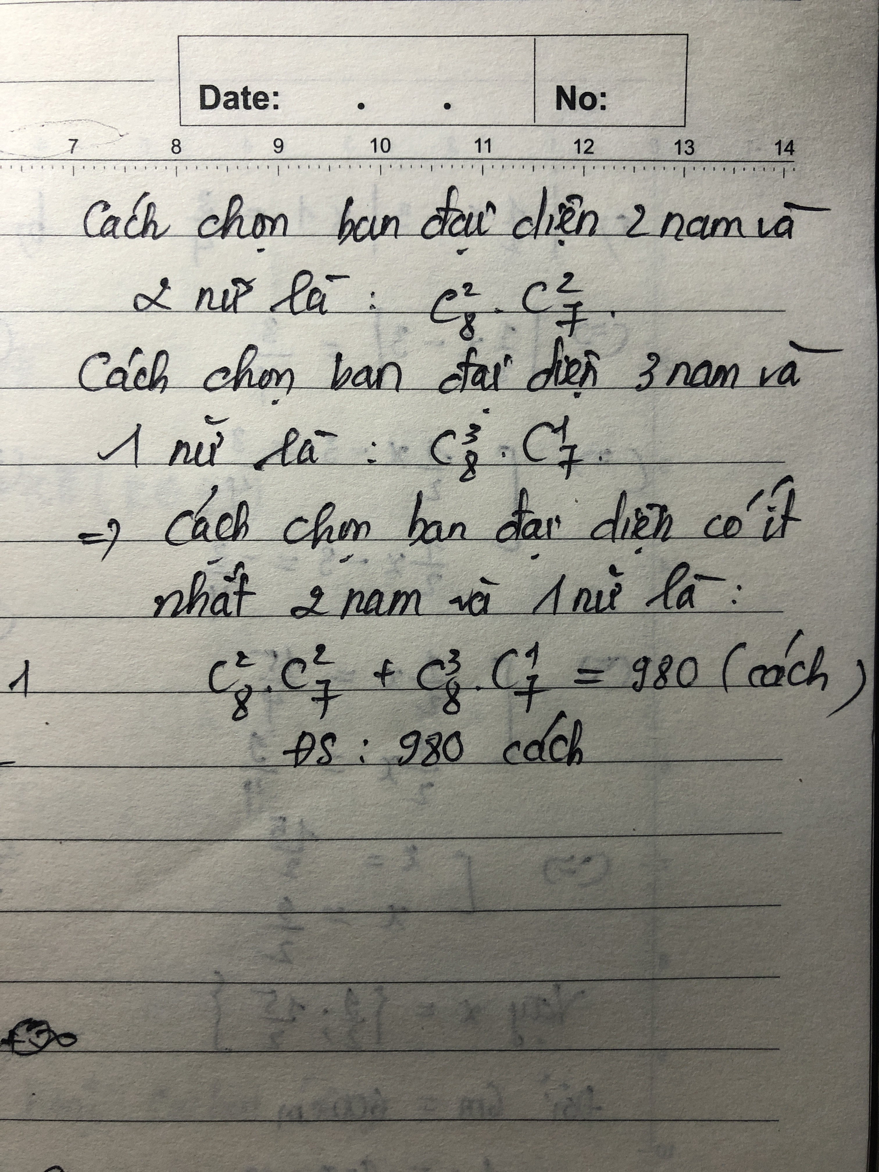 Câu 1. Có 15 học sinh gồm 8 nam và 7 nữ . Có bao nhiêu cách chọn 4 người để lập được một ban đại diện trong đó có ít nhất là 2 nam và 1 nữ .