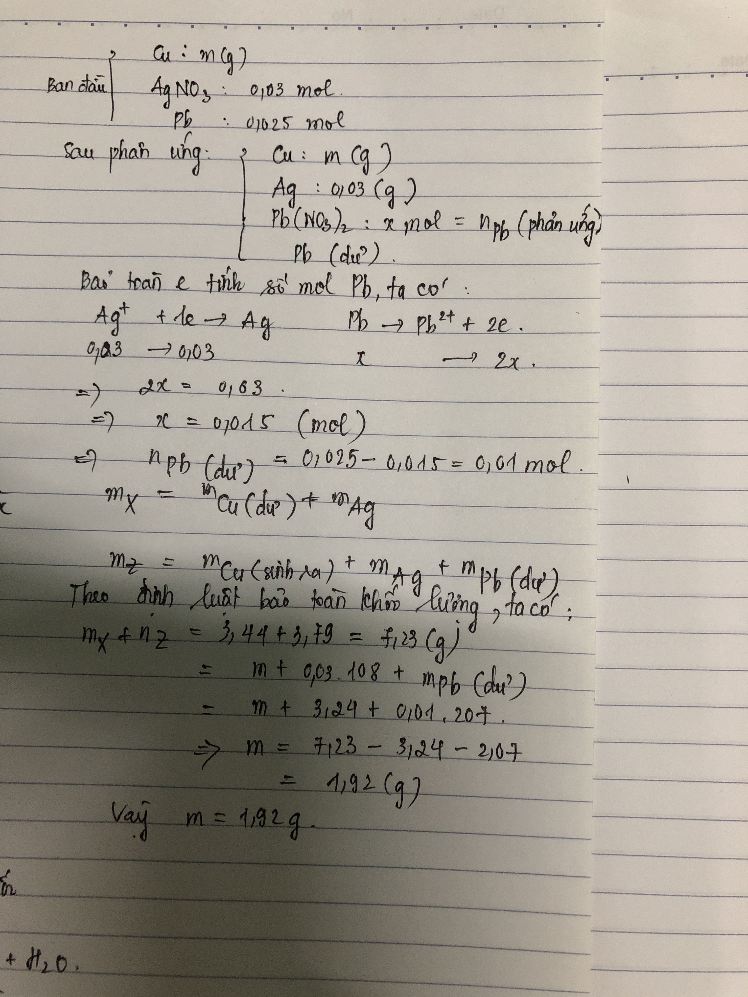 Cho m gam bột Cu vào 200 ml dung dịch AgNO3 0,15M sau một thời gian phản ứng thu được 3,44 gam chất rắn X và dung dịch Y. Cho 5,175 gam bột Pb vào dung dịch Y, thu được 3,79 gam chất rắn Z và dung dịch chứa một muối duy nhất. Giá trị của m là:
