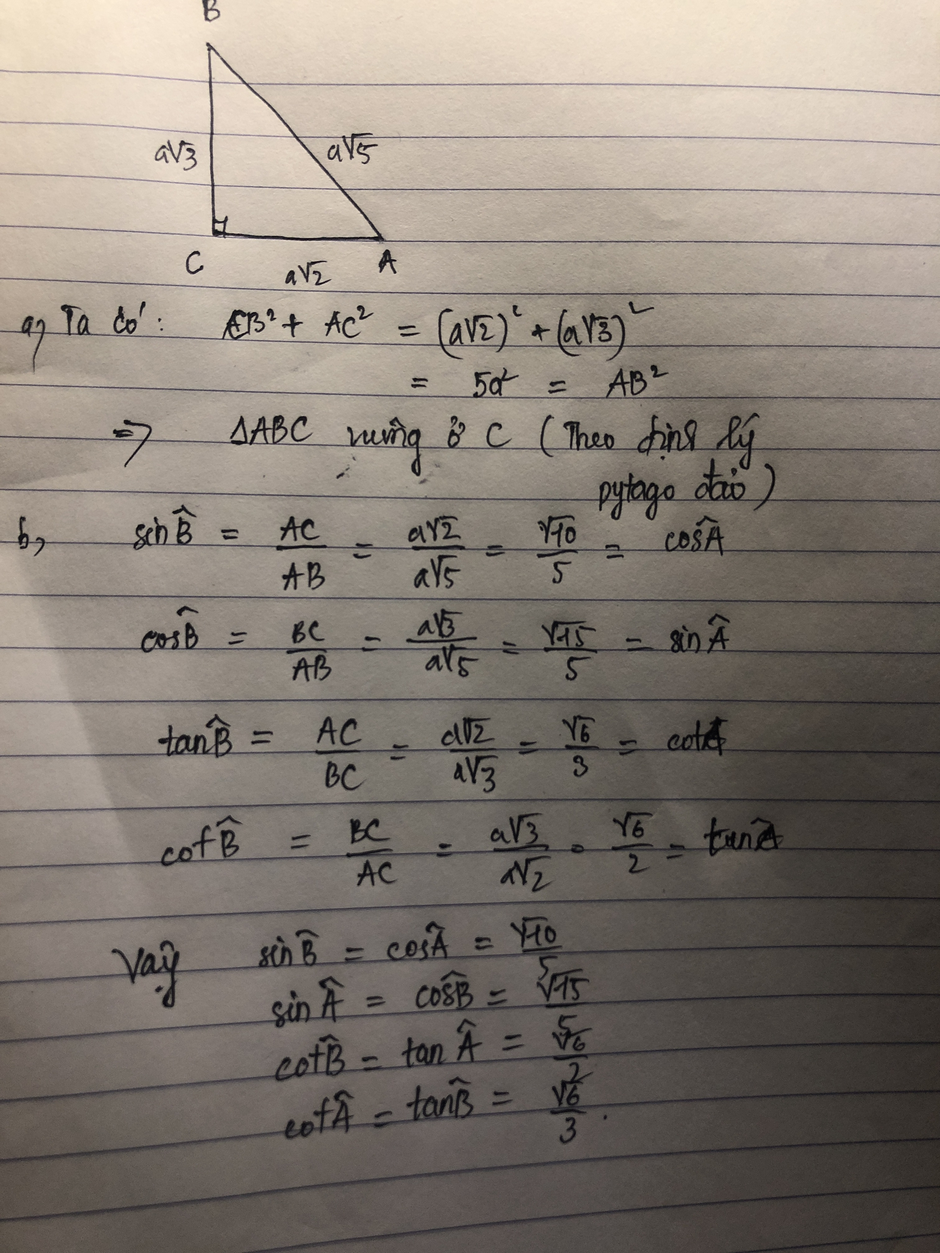 Cho tam giác ABC có AB=a√5 BC=a√3 ,AC=a√2