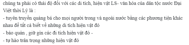 chúng ta phải có thái độ đối với các di tích, hiện vật LS- văn hóa của dân tộc nước Đại Việt thời Lý là :