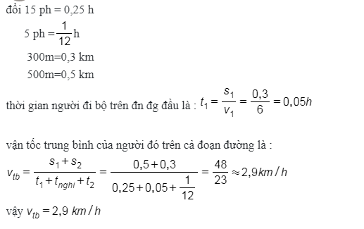 Một người đi bộ trên đoạn đường đầu dài 300m với vận tốc 6km/h rồi nghỉ 15 phút, sau đó đi tiếp 1 đoạn xuống dốc dài 500m hết 5 phút. Tính vận tốc trung bình của người đó trên cả đoạn đường