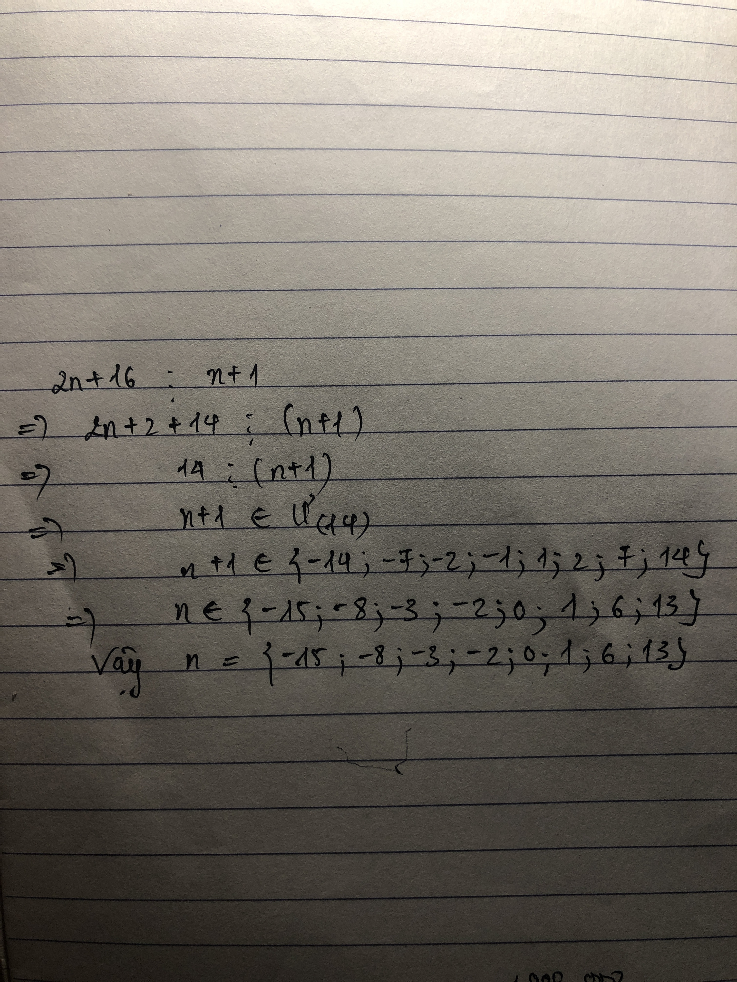 ⇒2(n+1)+14⋮(n+1)⇒2(n+1)+14⋮(n+1)⇒(n+1)∈Ư(14)={1;−1;2;−2;7;−7;14;−14}⇒(n+1)∈Ư(14)={1;−1;2;−2;7;−7;14;−14}