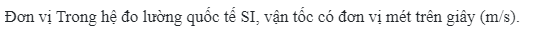 Đơn vị Trong hệ đo lường quốc tế SI, vận tốc có đơn vị mét trên giây (m/s).