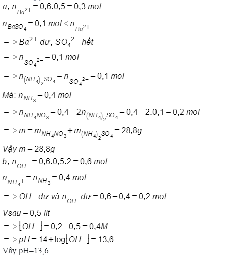 Câu 5: Cho m gam hỗn hợp (NH4)2SO4 và NH4NO3 tác dụng với 500ml dd Ba(OH)2 0.6M dư, đun nhẹ thu
