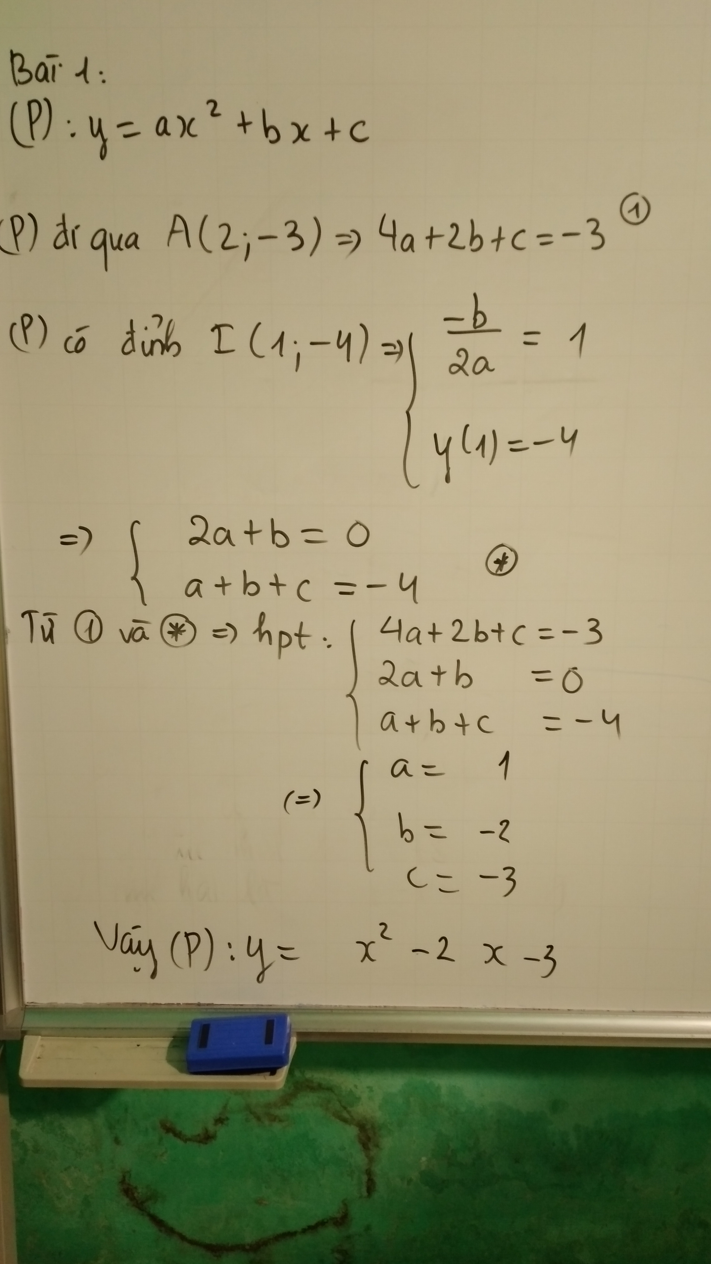 Xác định (P) biết: y=ax^2 +bx+c đi qua điểm A(2,-3) và có đỉnh I(1,-4)