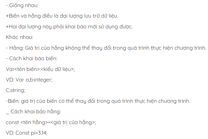 Biến và hằng có gì khác nhau và giống nhau? Cho VD khai báo biến và hằng