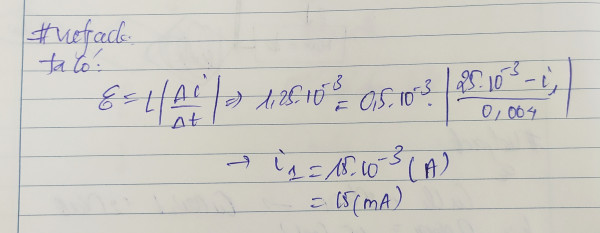 Một cuận dây có độ tự cảm là 0,5 mH, khi dòng điện trong cuận dây tăng từ giá trị i1 lên giá trị i2= 25mA trong thời gian 0.004 s thì suất điện động tự cảm trong cuận dây có độ lớn là 1,25.10^-3 V. Tìm i1
