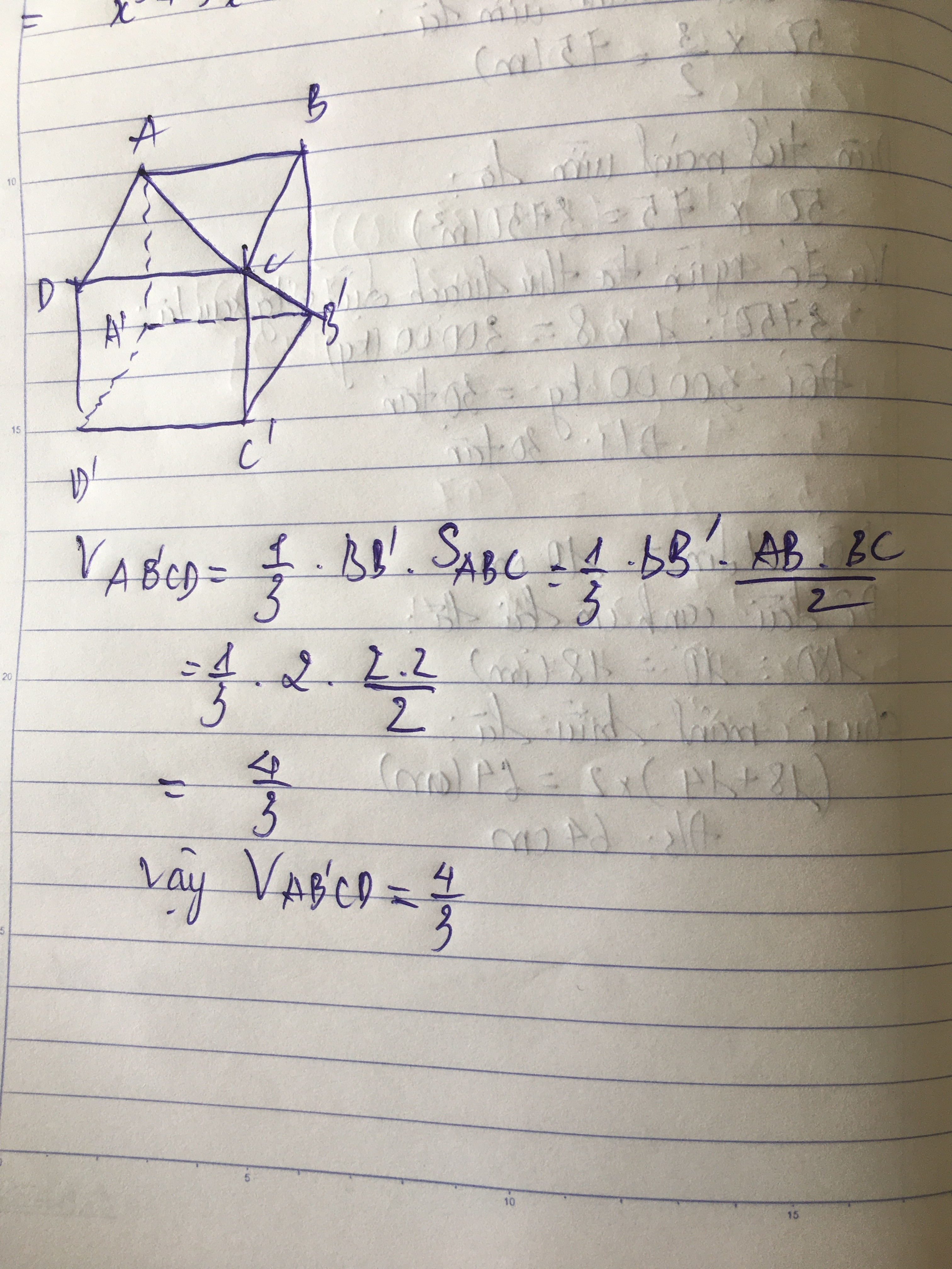 Cho khối lập phương ABCD.A’B’C’D’ có cạnh bằng 2. Thể tích của khối đa diện AB’CB bằng