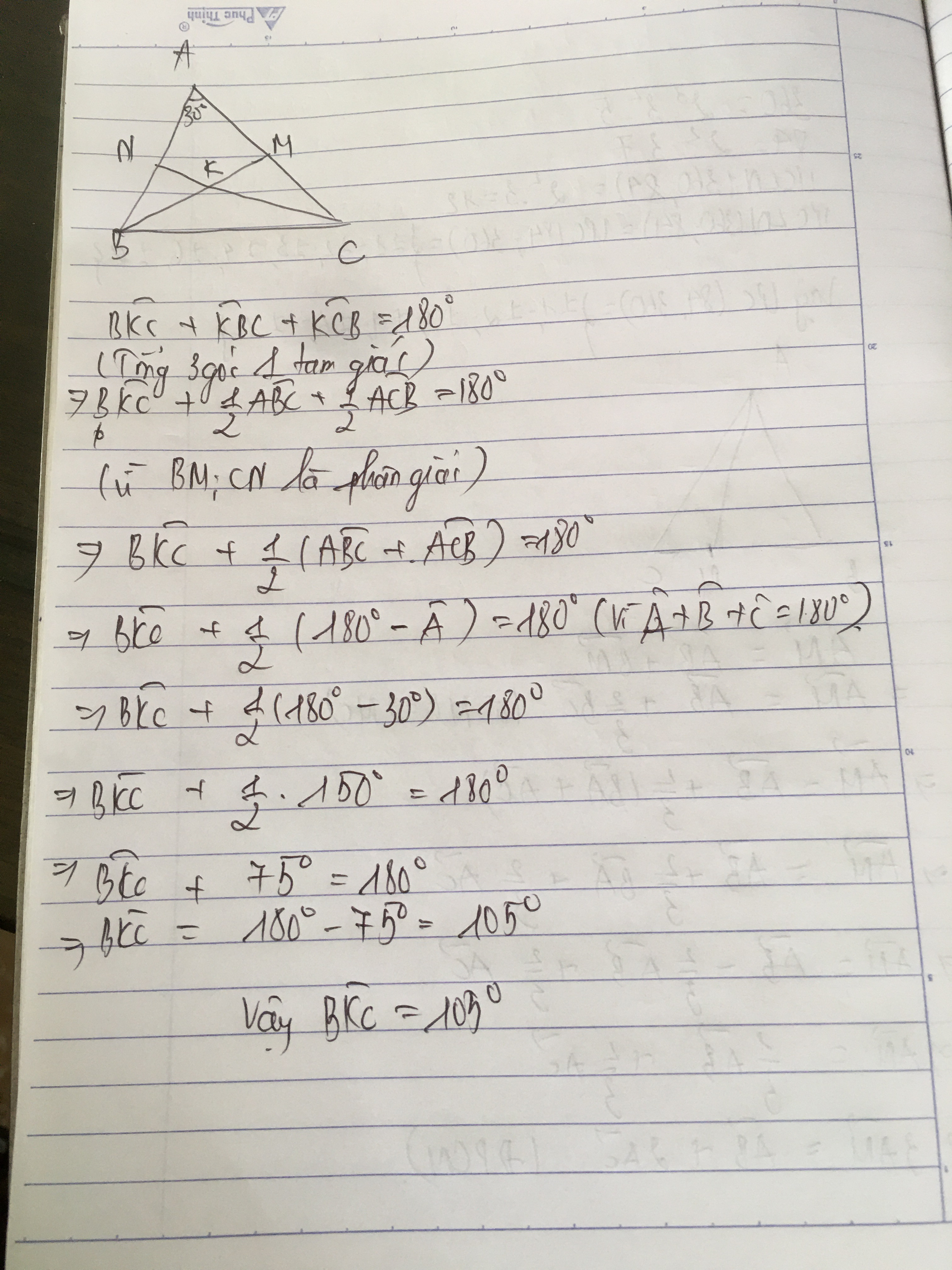 Cho tia phân giác ABC, kẻ phân giác BM,CN cắt nhau tại K. Biết góc A có số đo là 30° . Hỏi số đo BKC bằng bao nhiêu ?