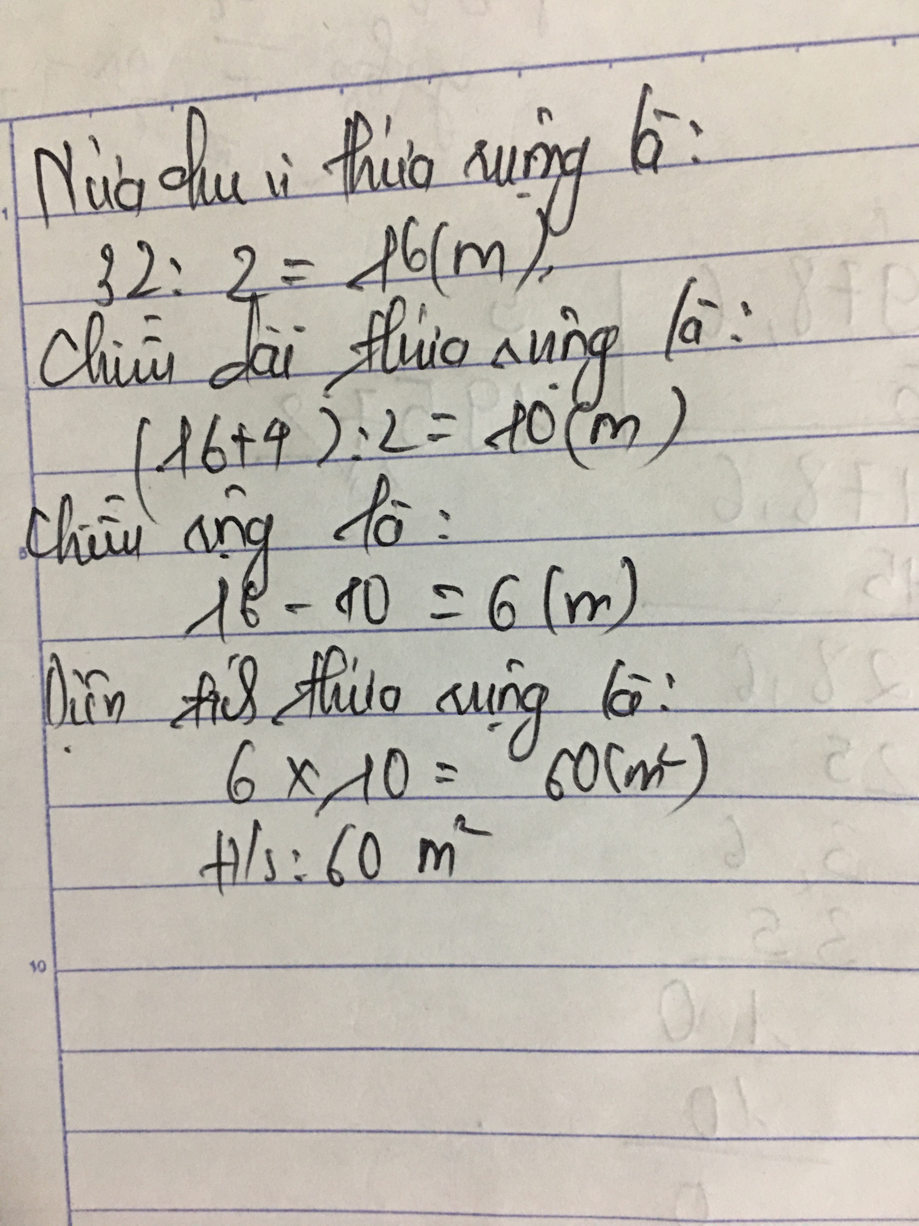 Một thửa ruộng hình chữ nhật có chu vi là là 32 m, chiều dài hơn chiều rộng là 4m. Tính diện tích hình chữ nhật đó.
