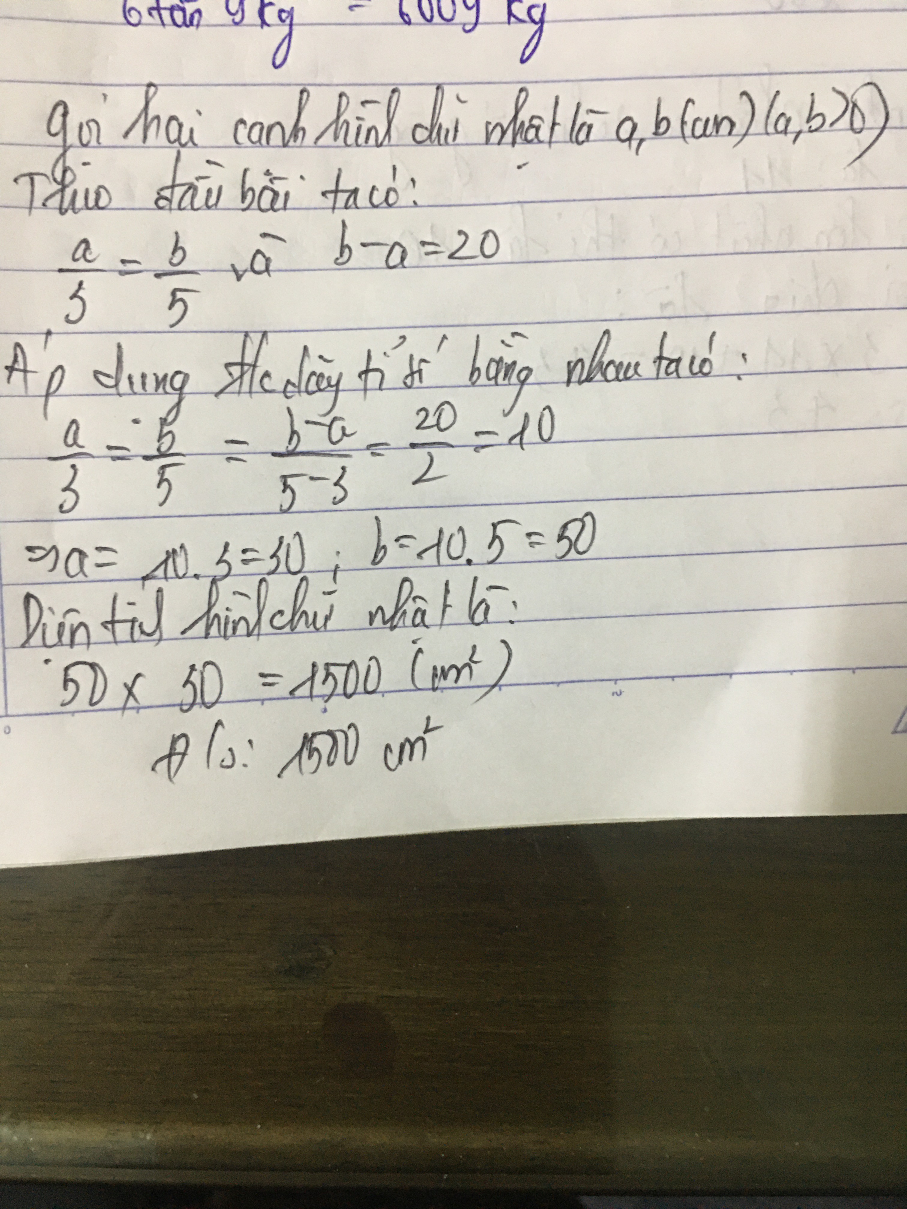 Một hình chữ nhật có 2 cạnh tỉ lệ với 3 và 5.Tính diện tích của hình chữ nhật đó biết chiều rộng ngắn hơn chiều dài 20cm