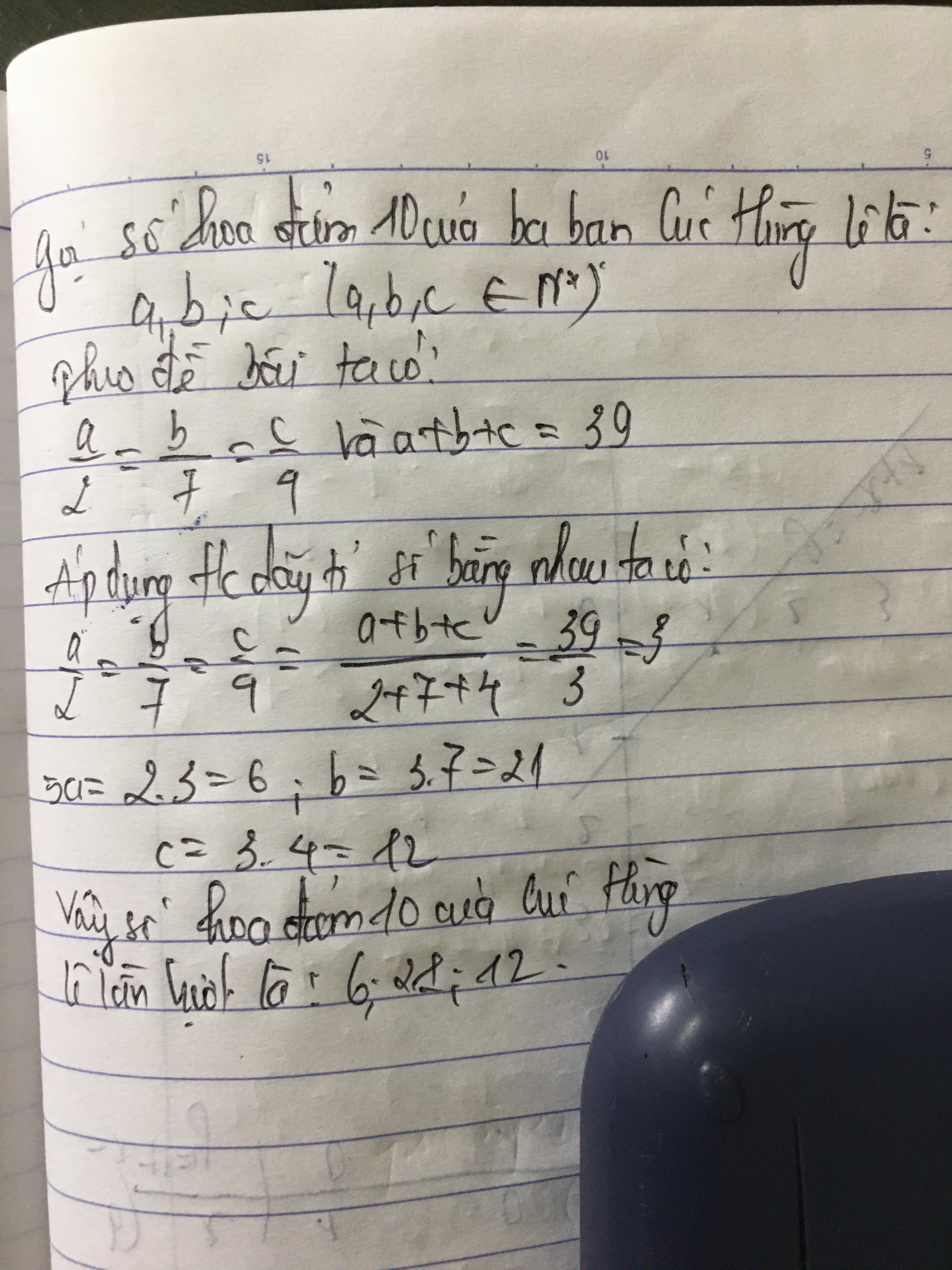 Số bông hoa điểm 10 của ba bạn Cúc, Hùng, Lê tỉ lệ với các số 2; 7;4. Tính số bông hoa điểm 10 của mỗi bạn, biết rằng ba bạn có tất cả 39 Bông Hoa điểm Mười