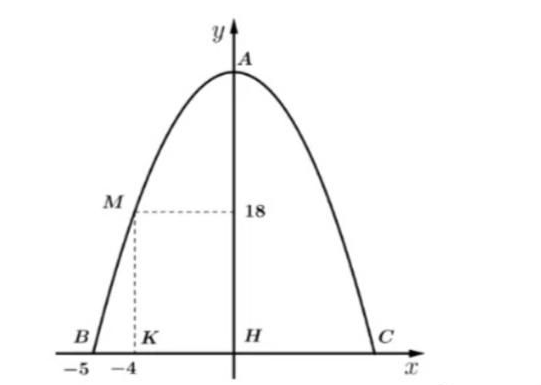 Một cái cổng hình Parabol. Người ta đo khoảng cách giữa hai chân cổng BC là 10m. Từ một điểm M trên thân cổng người ta đo được khoảng cách tới mặt đất là MK = 18m và khoảng cách tới điểm chân cổng gần nhất là BK = 1m. Chiều cao của cổng bằng?