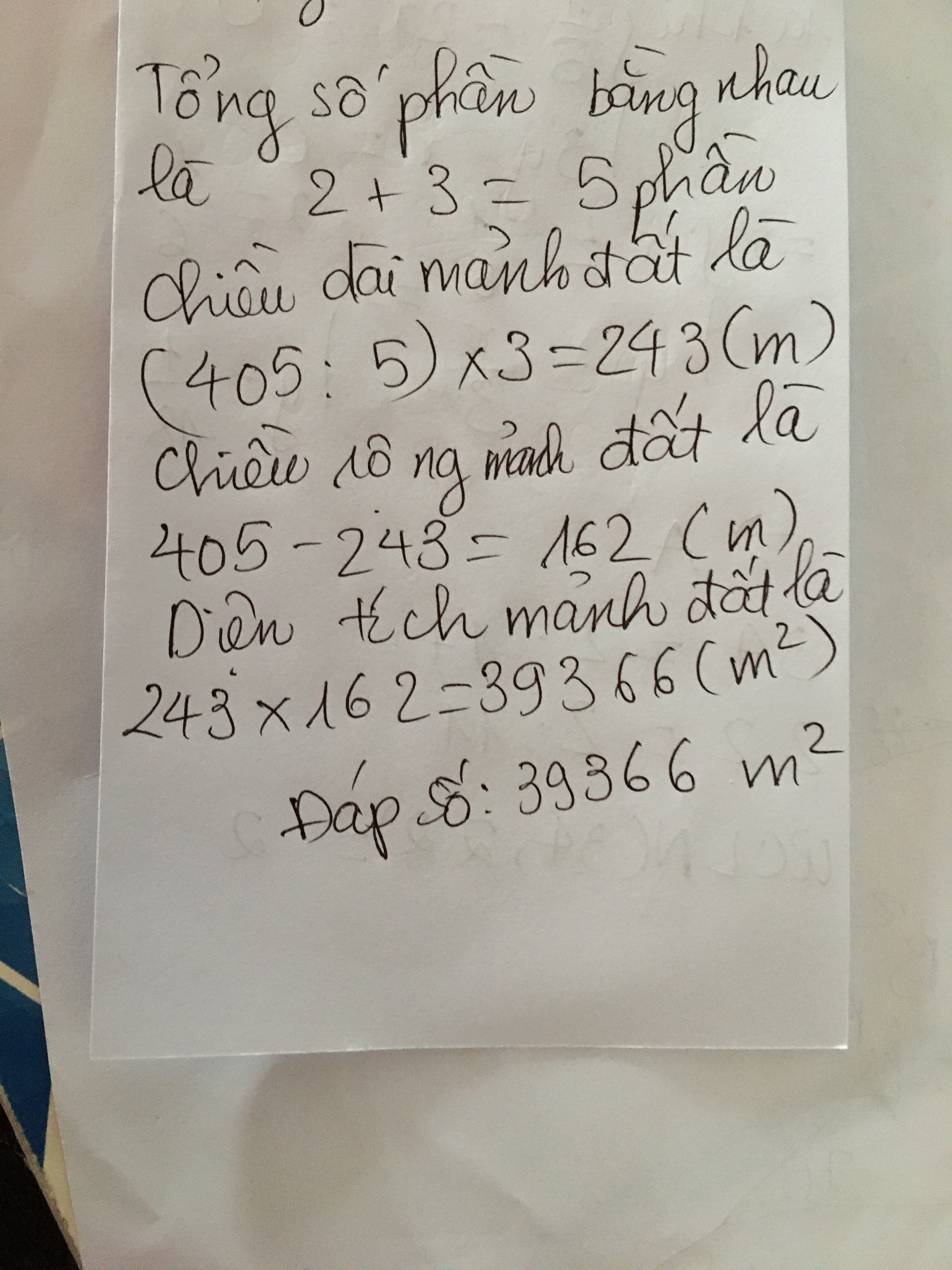 Một mảnh đất HCN có nửa chu vi 405m chiều dài bằng 3/2 chiều rộng.