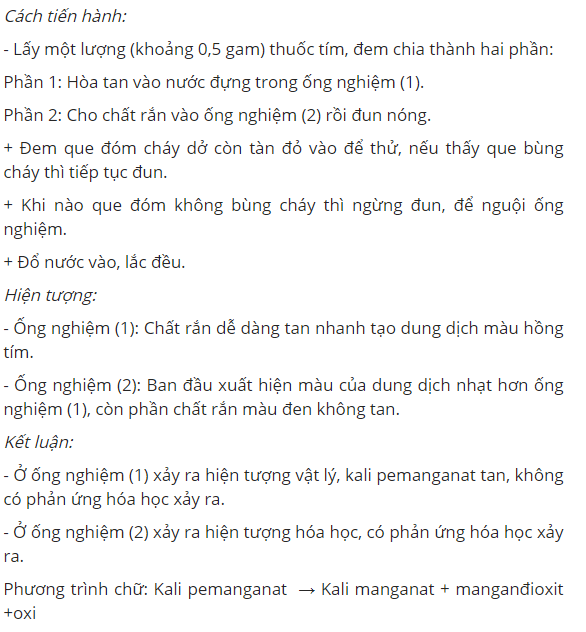 - Sau đó đổ nước vào, lắc cho tan hết. Nhận thấy chỉ có một phần tan trong nước, màu dung dịch nhạt hơn ống nghiệm 1.Thuốc tím khi bị đun nóng sinh ra các chất rắn: Kalimanganat, Manganđioxit và Khí oxi.
