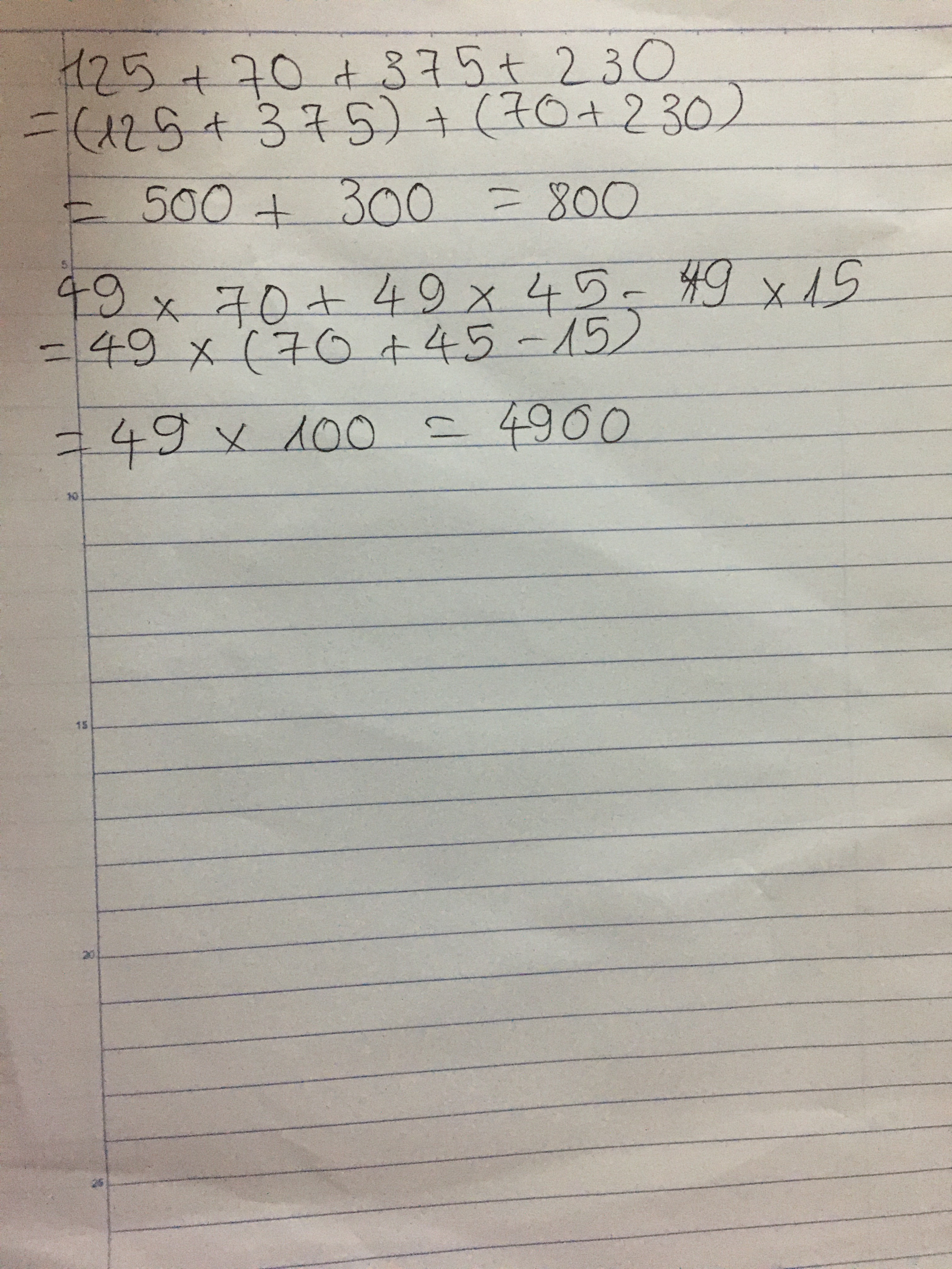 = \left( {125 + 375} \right) + \left( {70 + 230} \right)\\