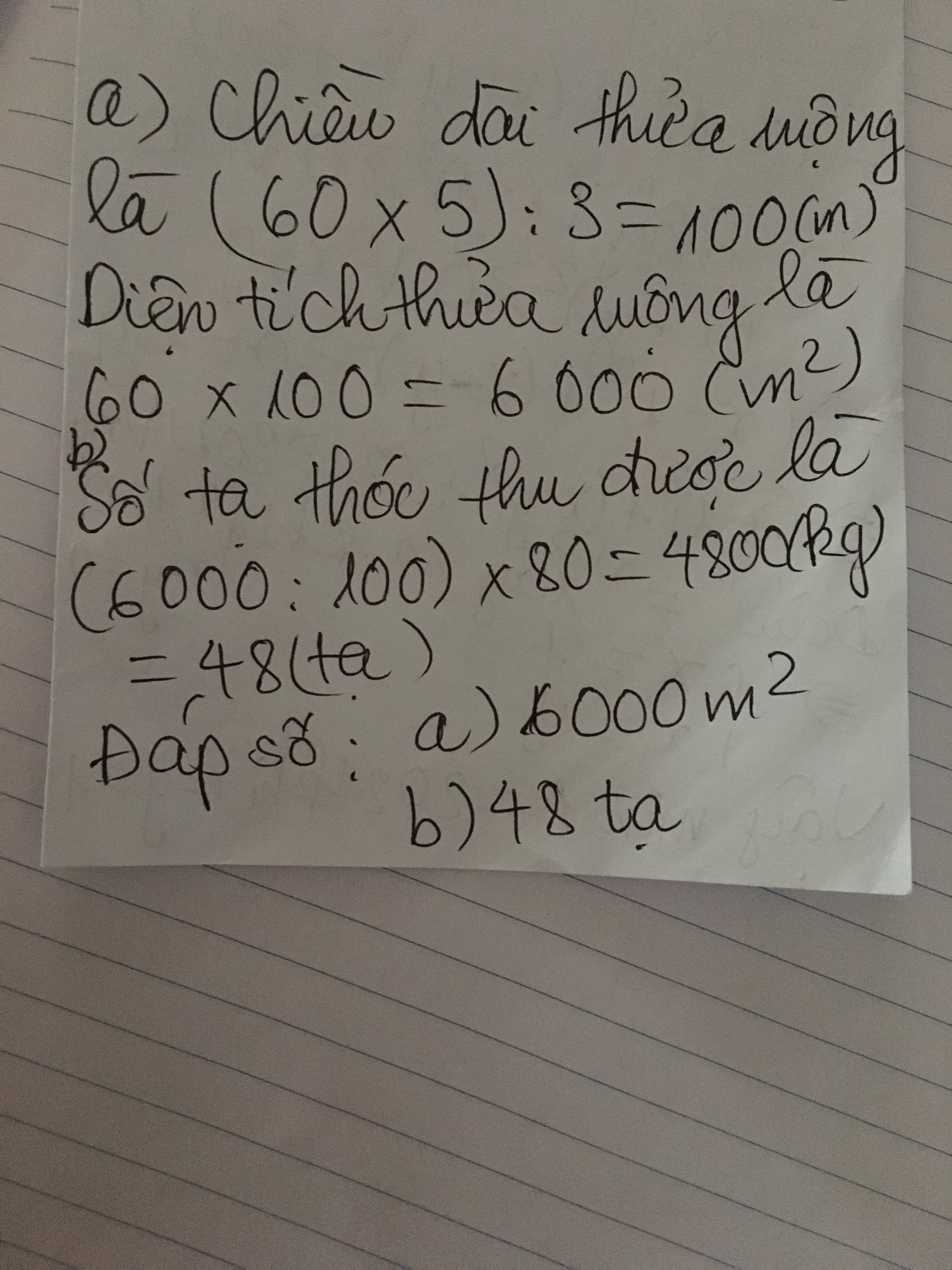 b. Biết trung bình cứ 100m2 thu hoạch được 80 kg thóc. Hỏi trên cả thửa rộng đó, người ta thu hoạch được bao nhiêu tạ thóc?