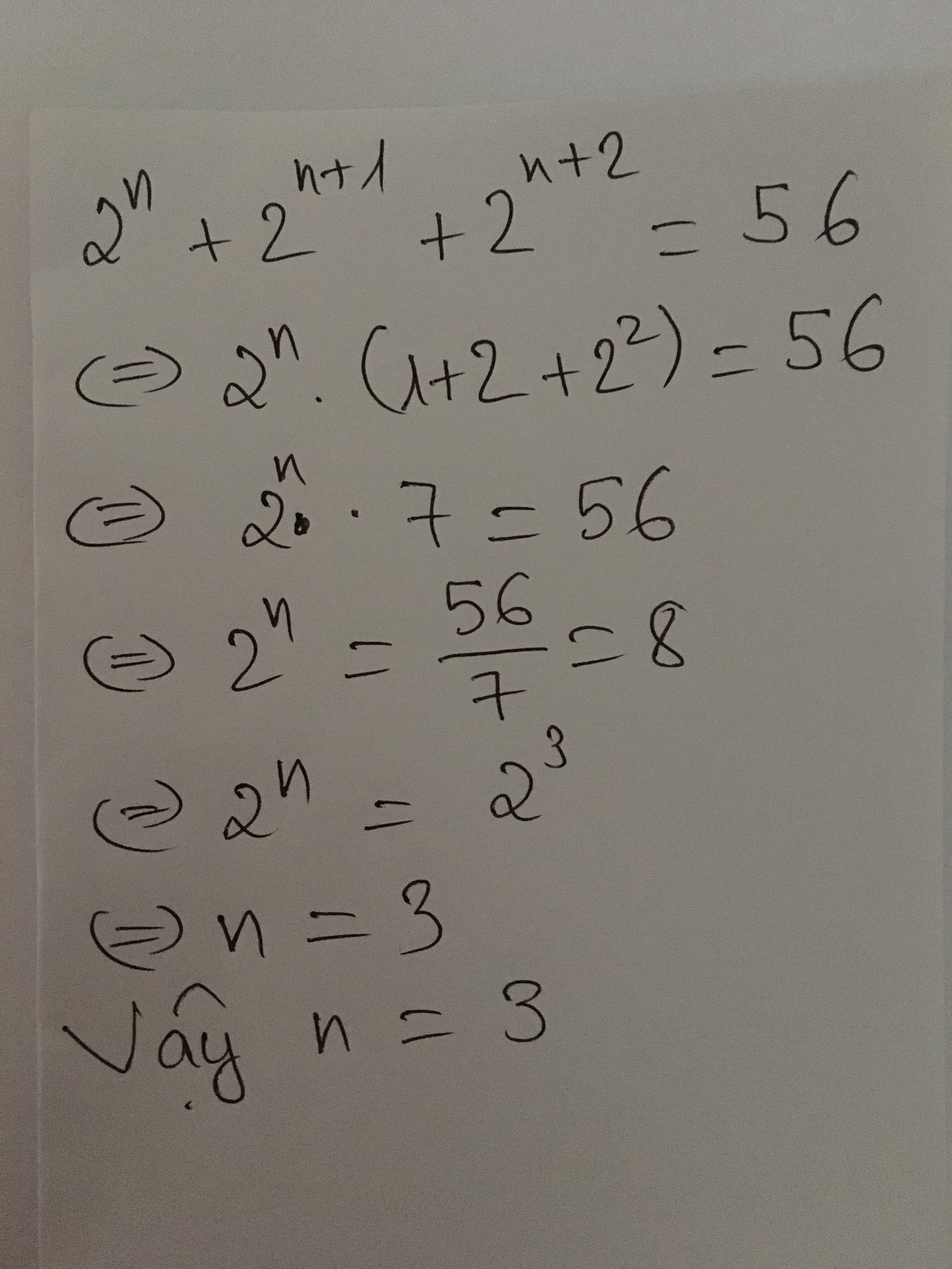 Tìm số tự nhiên n biết 2 mũ n+2 mũ n+1+2 mũ n+2=56