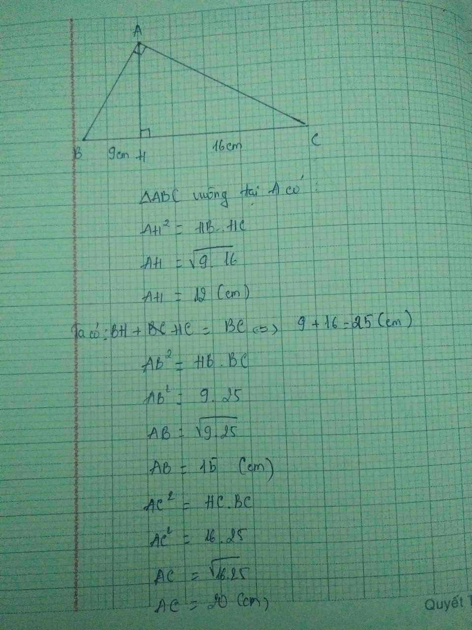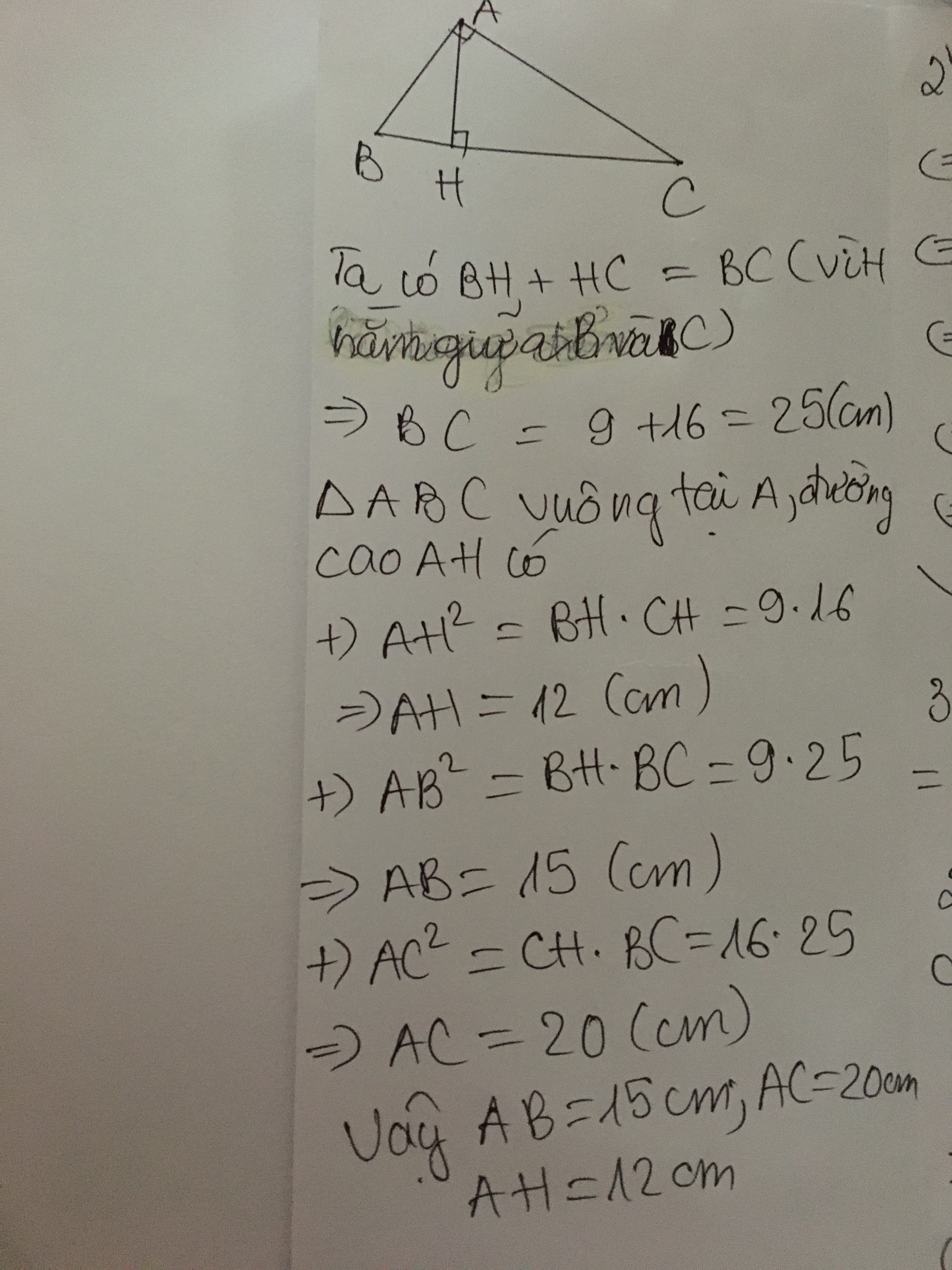 đường cao AH.Biết HB= 9cm, HC = 16cm. Tính độ dài các đoạn thẳng AB,AC và AH.