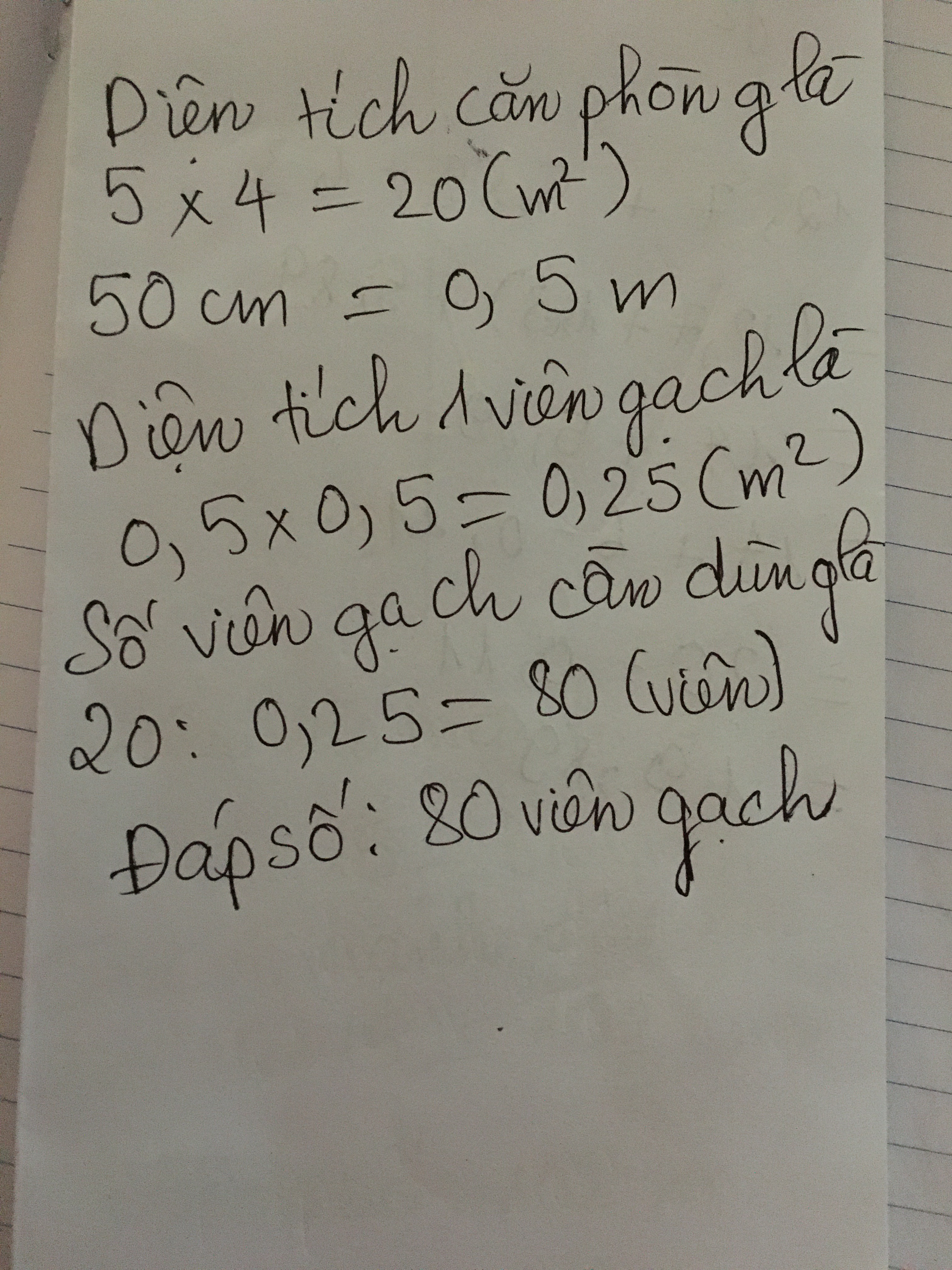 Một căn phòng hình vuông có chiều dài 5m chiều rộng 4m .Người ta dùng các viên gạch hình vuông có cạnh là 50cm để lót hết căn phòng cần bao nhiêu viên