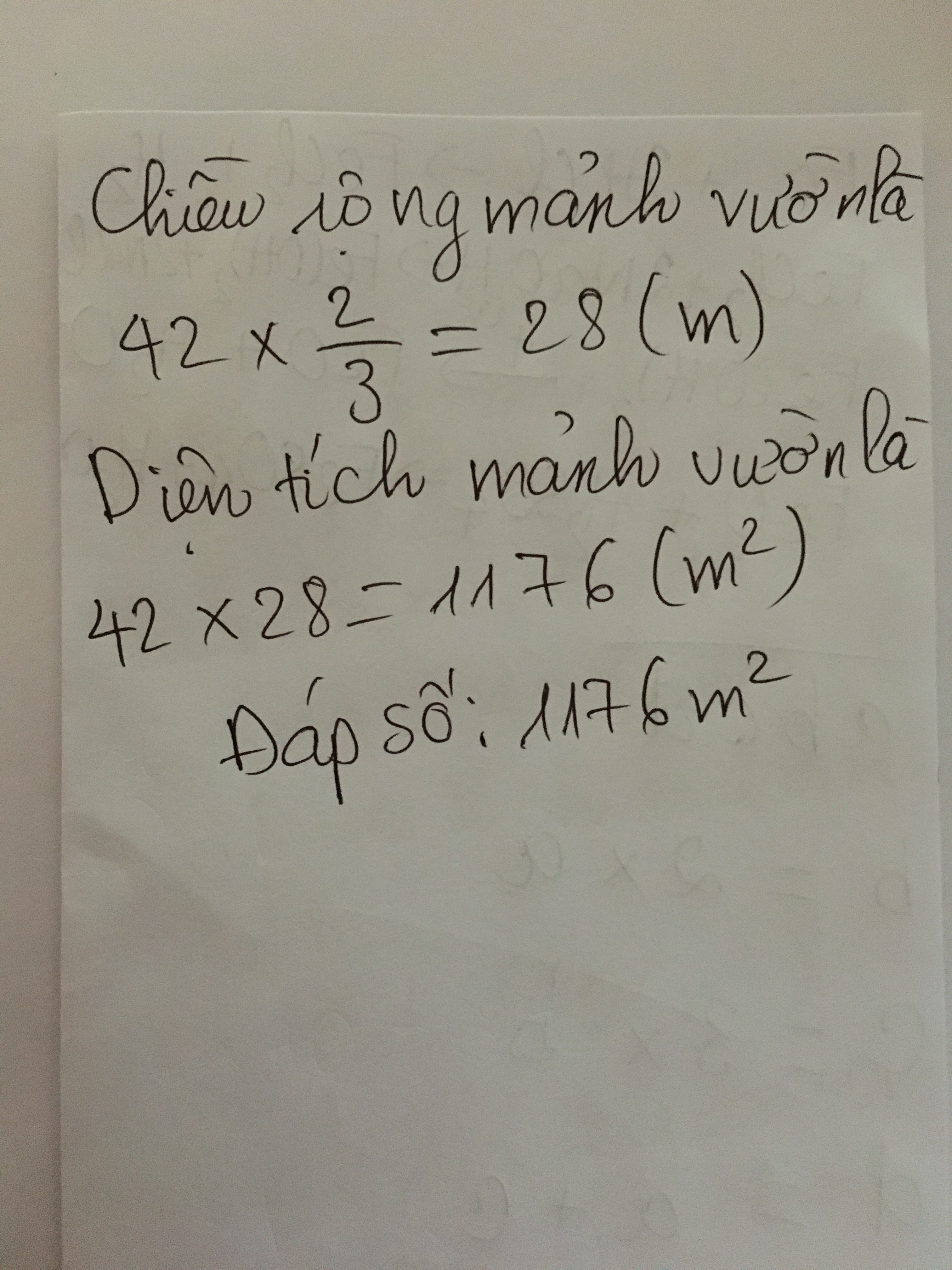 Một mảnh vườn hình chữ nhật có chiều dài 42 m chiều rộng bằng 2/3 chiều dài Tính diện tích mảnh đất đó